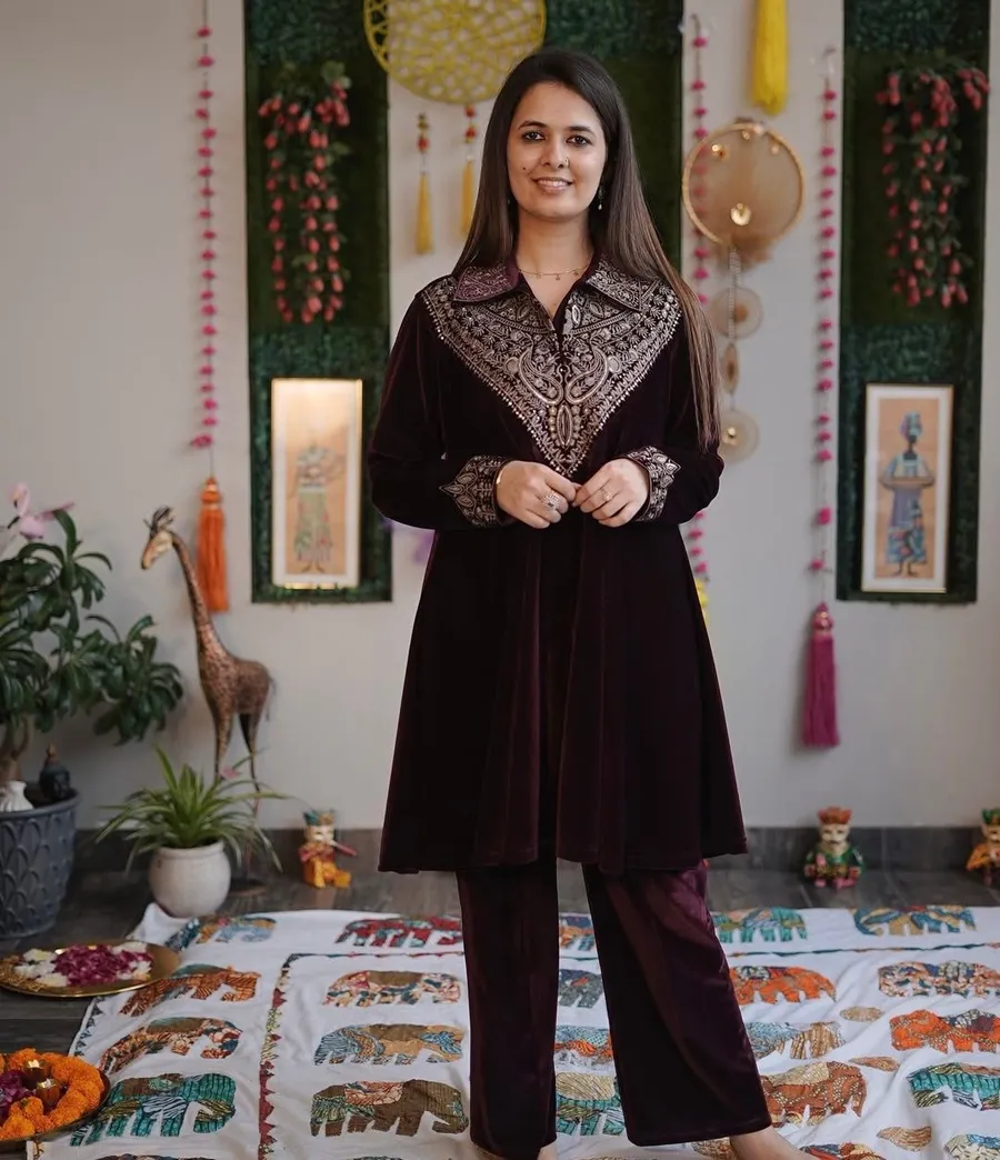 DESIGNER VELVET SEQUENCE EMBROIDERY WORK TOP PALAZZO SET PURPLE