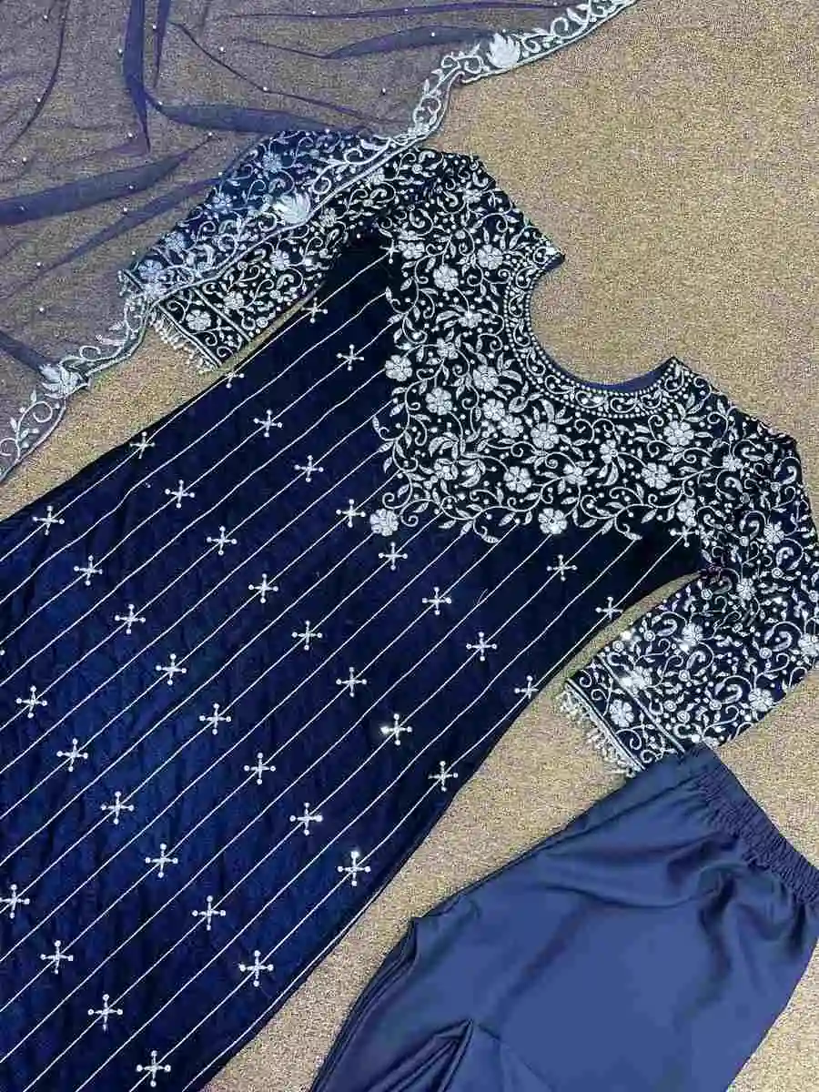 DESIGNER VELVET SEQUENCE WORK WITH RIVET MOTI WORK AND HANGING LACE WORK TOP BOTTOM WITH DUPATTA BLUE
