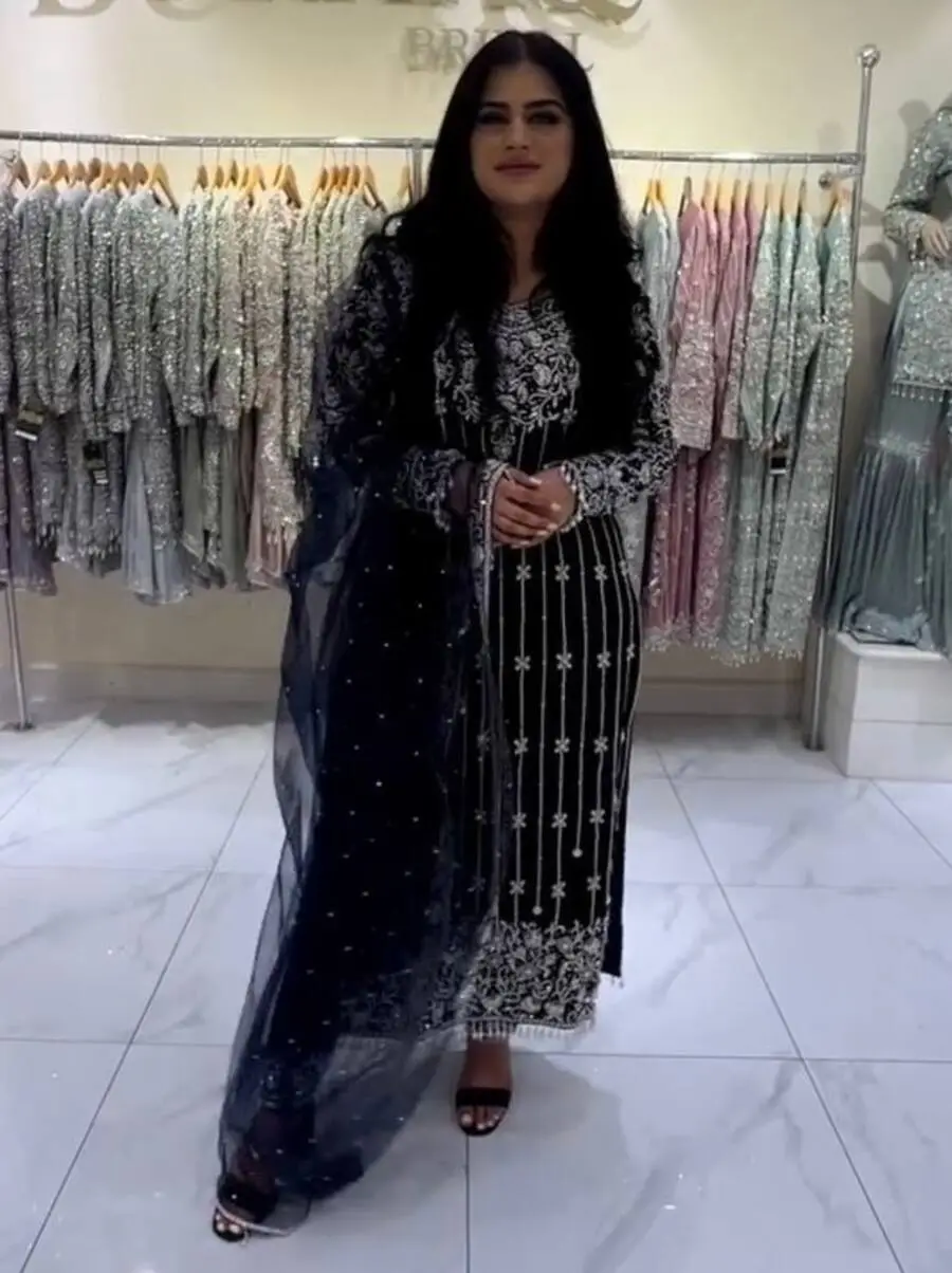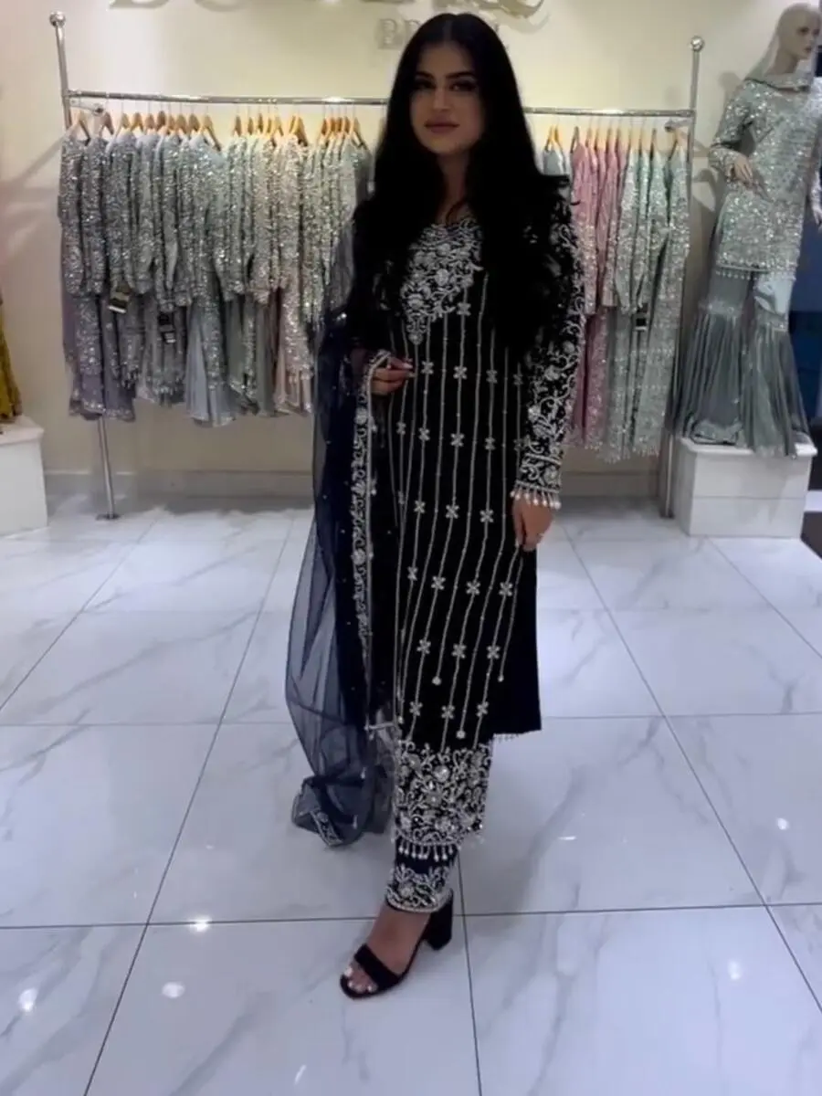 TOP FABRIC :HEAVY PURE VISCOSE VELVET WITH EMBROIDERY 5 MM SEQUENCE WORK WITH FANCY BELL SLEEVE & FANCY MOTI LATKAN