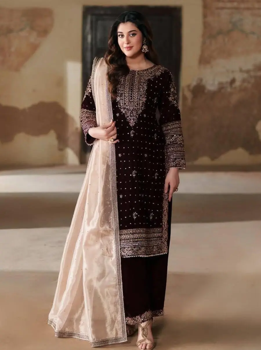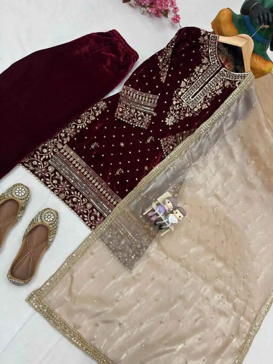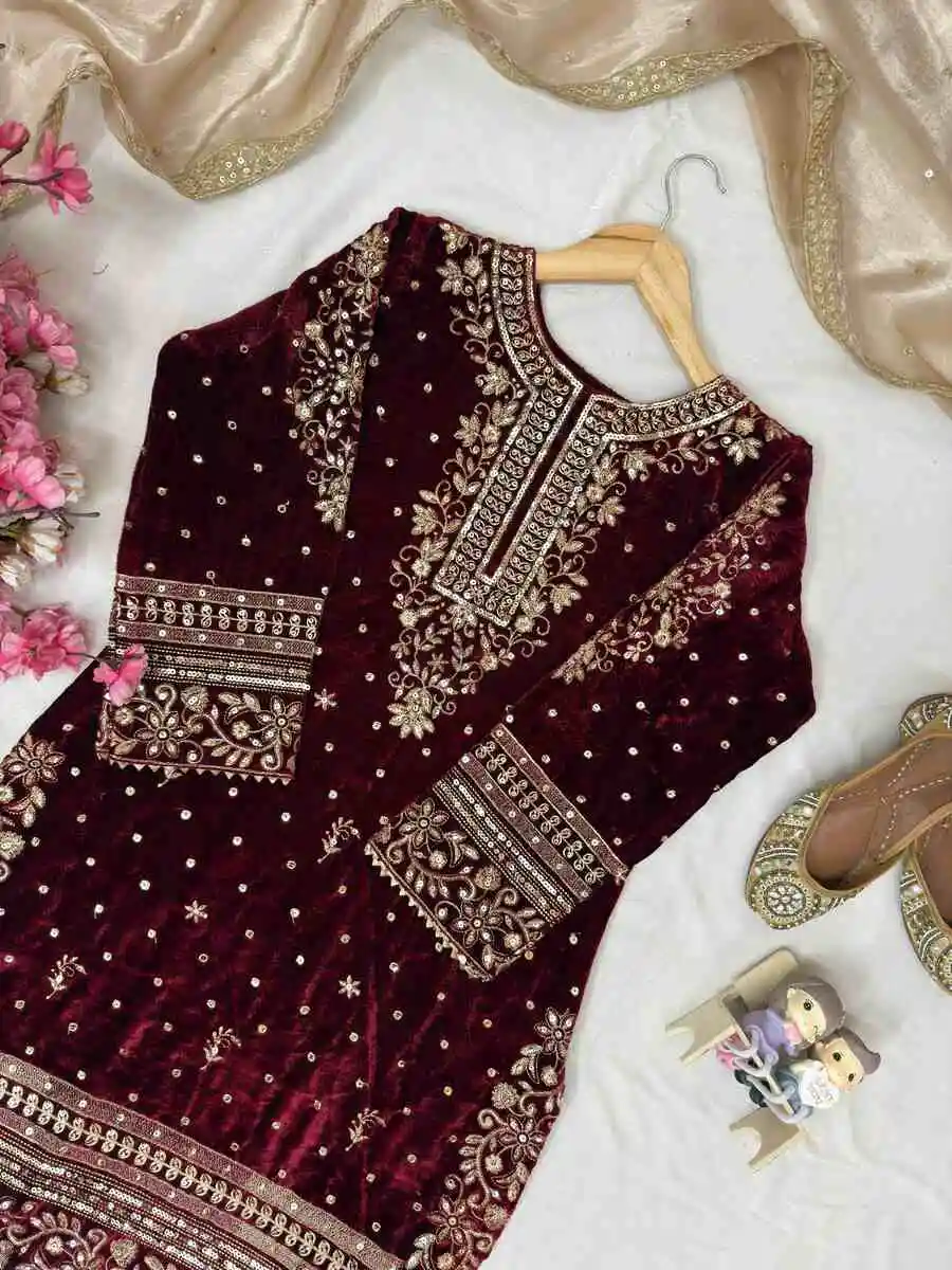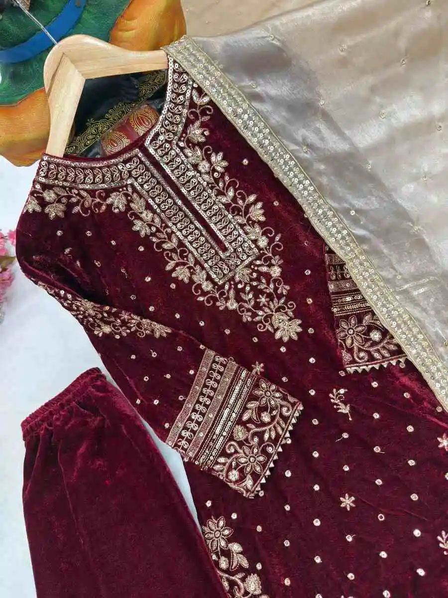 DESIGNER VELVET SEQUENCE & ZARI EMBROIDERY WORK TOP PALAZZO WITH DUPATTA MAROON