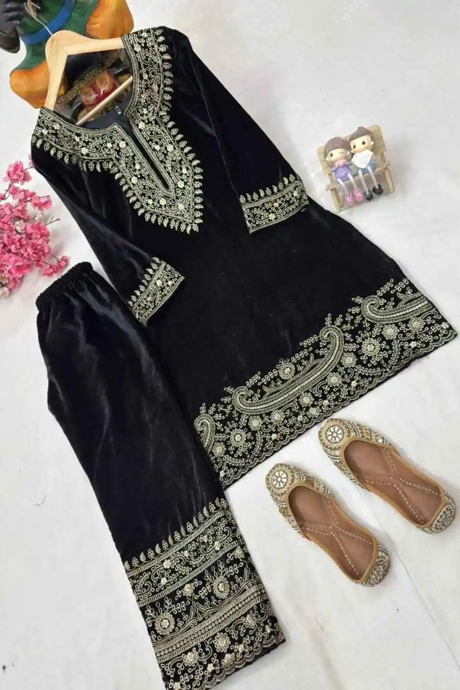 DESIGNER VELVET ZARI EMBROIDERY WORK TOP BOTTOM SET BLACK