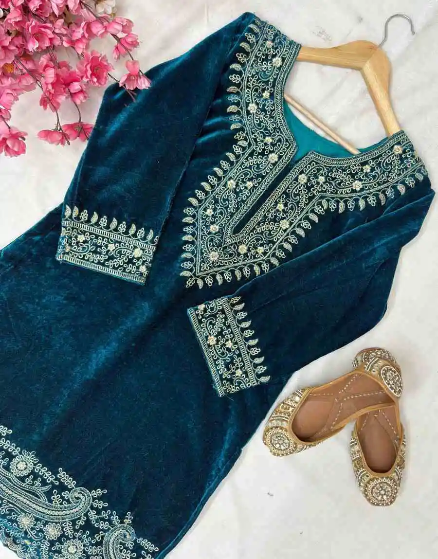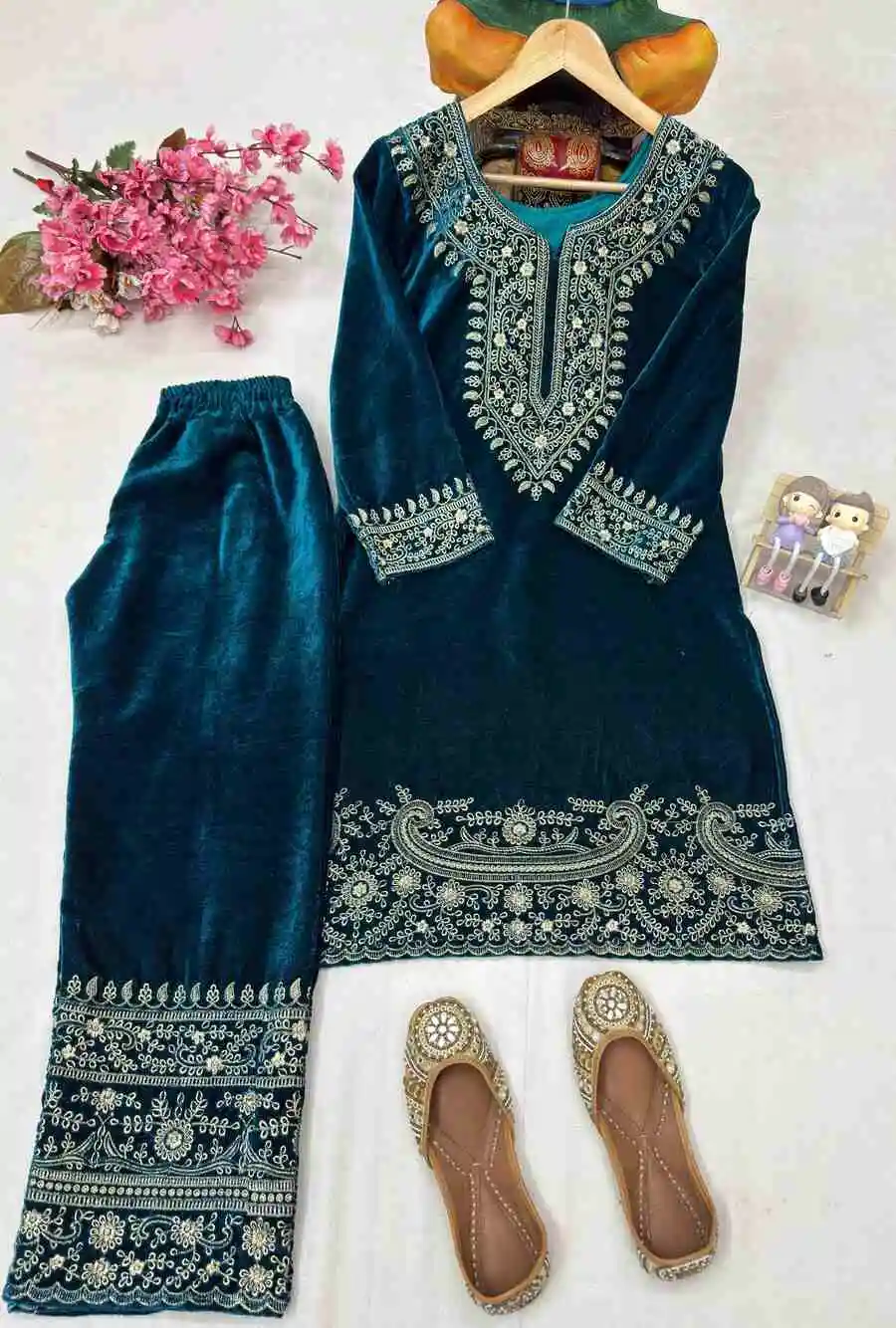 DESIGNER VELVET ZARI EMBROIDERY WORK TOP BOTTOM SET RAMA