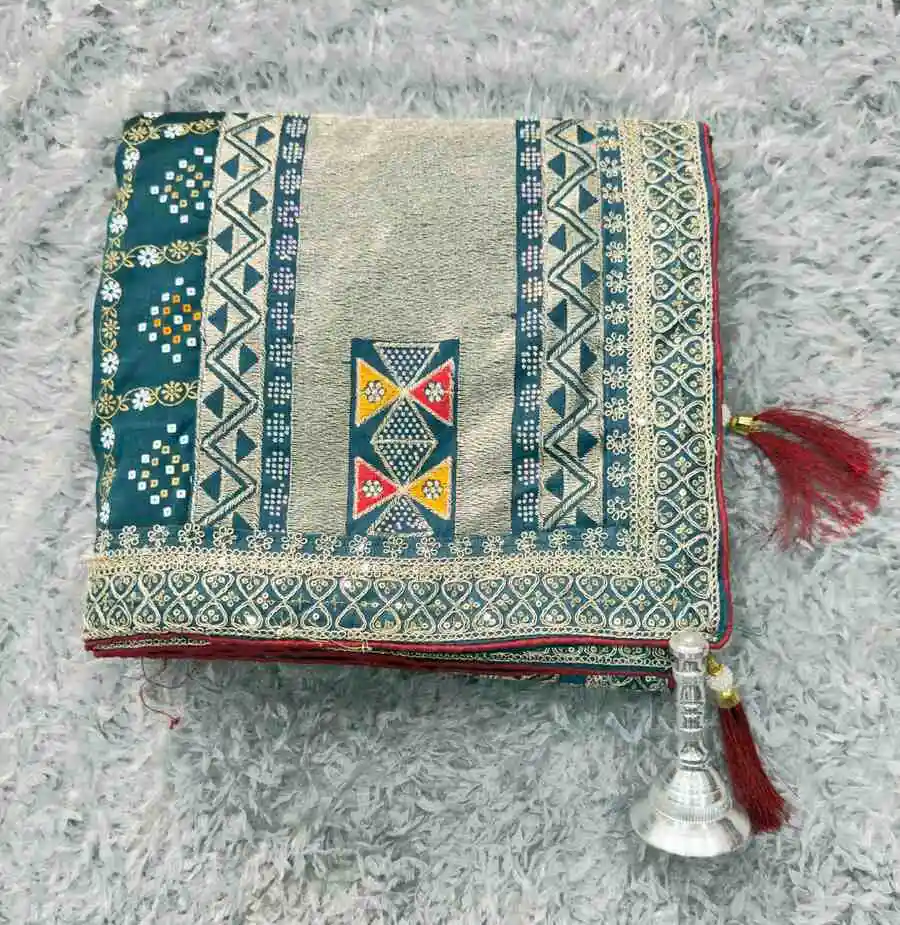 DESIGNER VICHITRA FOIL PRINT EMBROIDERY THREAD & SEQUENCE WORK AND HOT FIX DIMOND WORK SAREE WITH UNSTITCHED BLOUSE TEAL