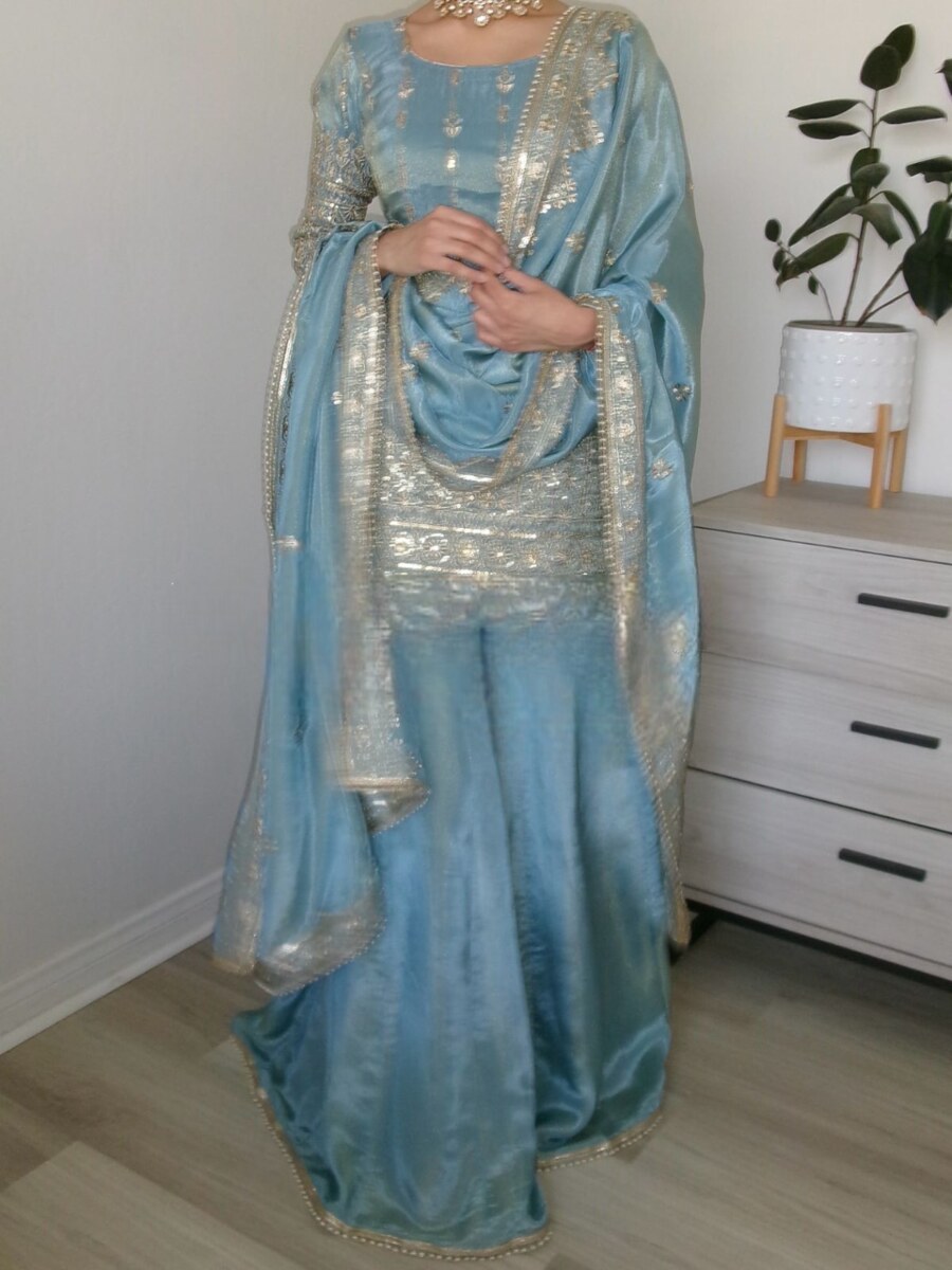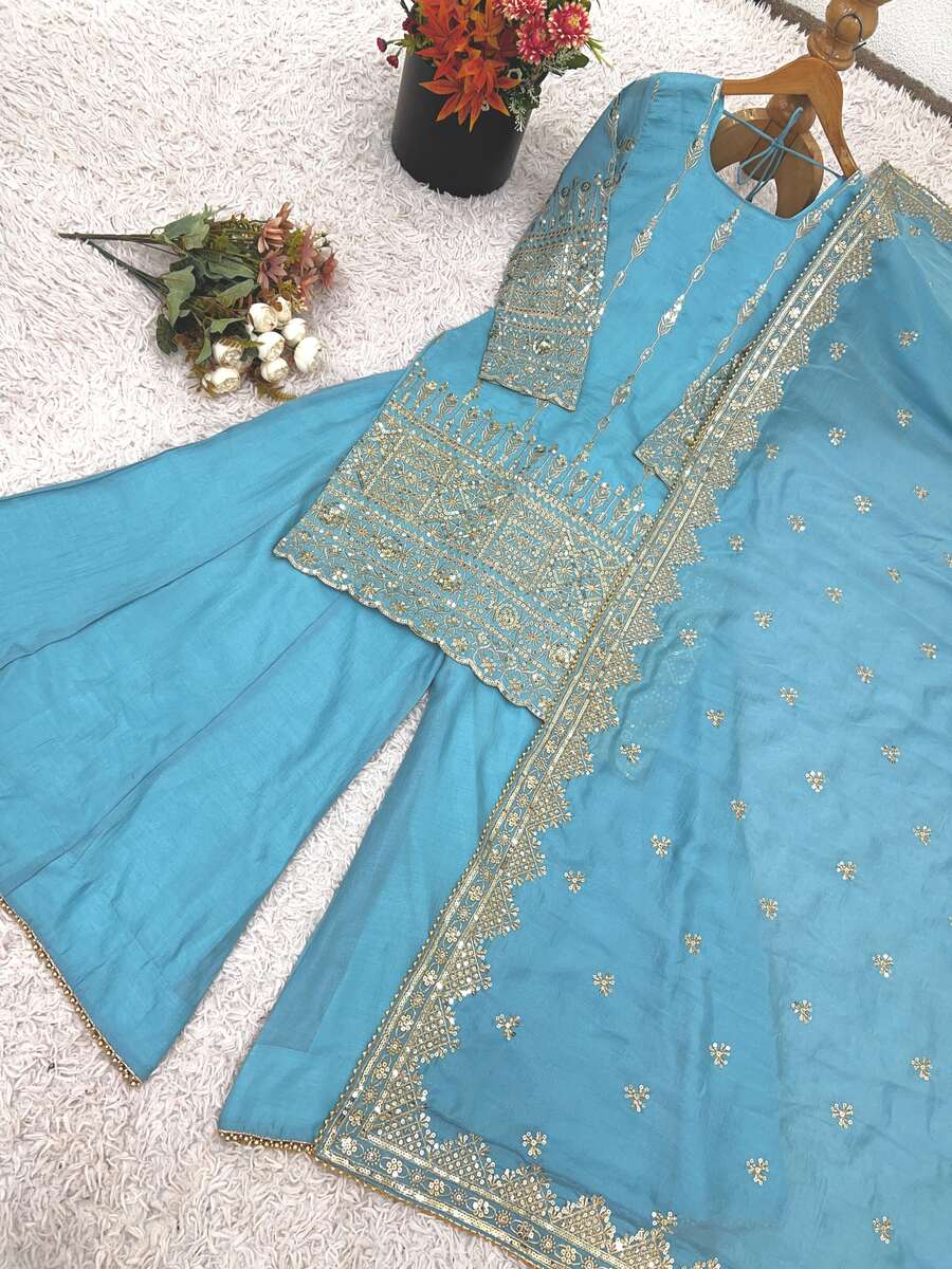 DESIGNER VICHITRA SILK EMBROIDERY SEQUENCE WORK TOP PALAZZO WITH DUPATTA SKY