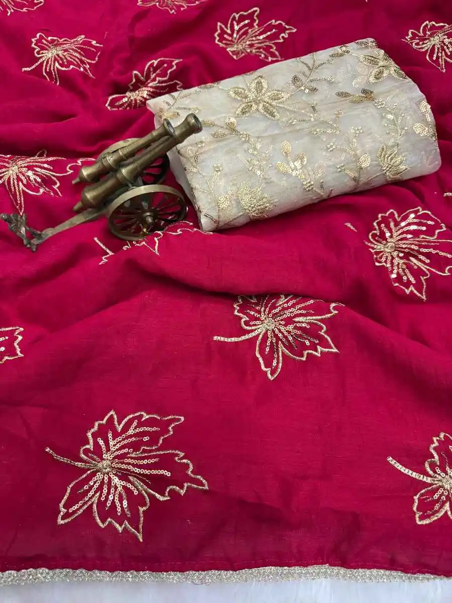 DESIGNER VICHITRA SILK SEQUENCE EMBROIDERY WITH READYMADE LACE BORDER WORK SAREE WITH UNSTITCHED BLOUSE RANI
