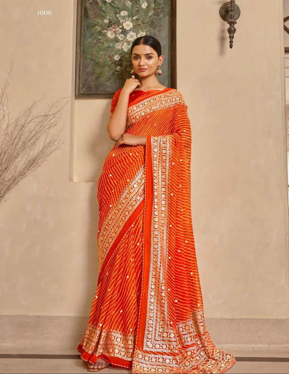DIGITAL PRINT DESIGN WITH MULTI COLOUR PIPING SAREE AND GEORGETTE BLOUSE PARTY WEAR