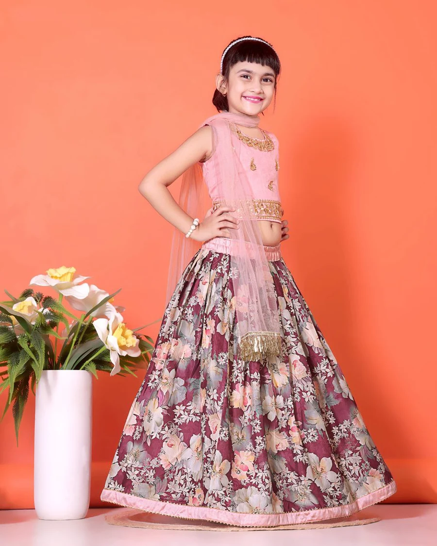 FANCY BANGLORI DIGITAL FLOWER PRINT WITH LACE BORDER WORK KID’S LEHENGA CHOLI WITH DUPATTA WINE