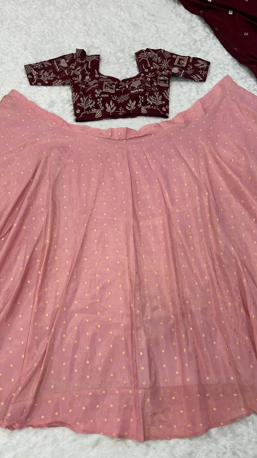 FANCY BANRASI JARI SILK BUTTI WORK LEHENGA CHOLI WITH DUPATTA WINE AND BABY PINK