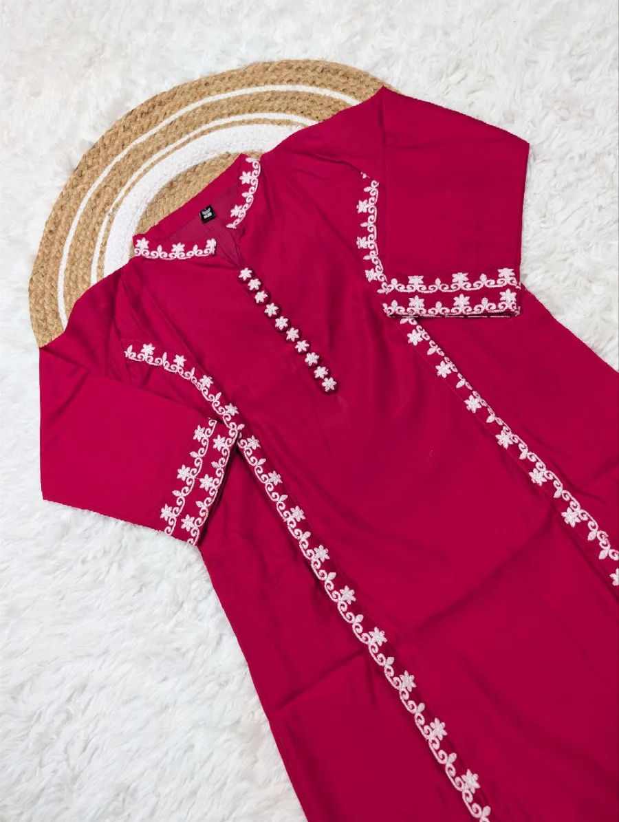 KURTI FABRIC :- 14KG REYON WITH EMBROIDERY DESIGN WORK FULL STITCH NAYRA PATTERN KURTI