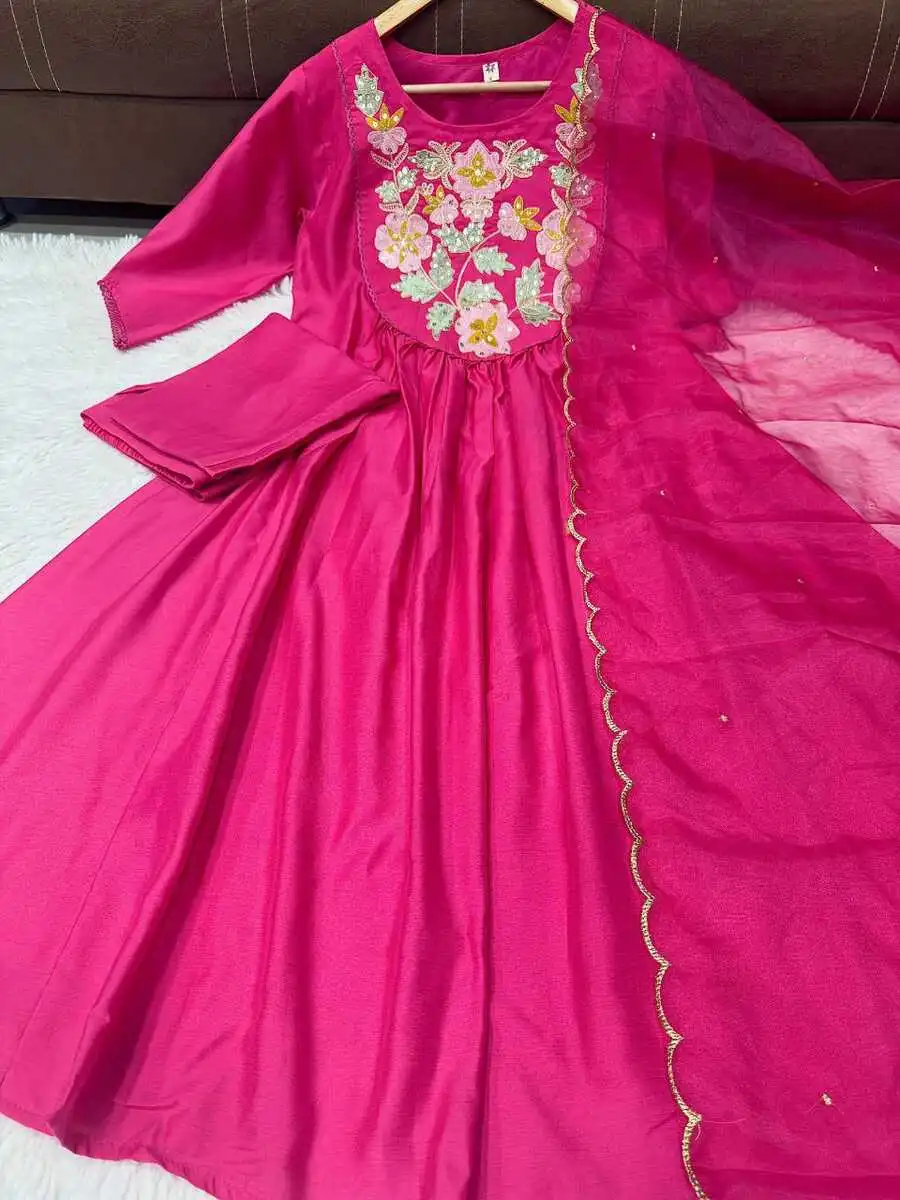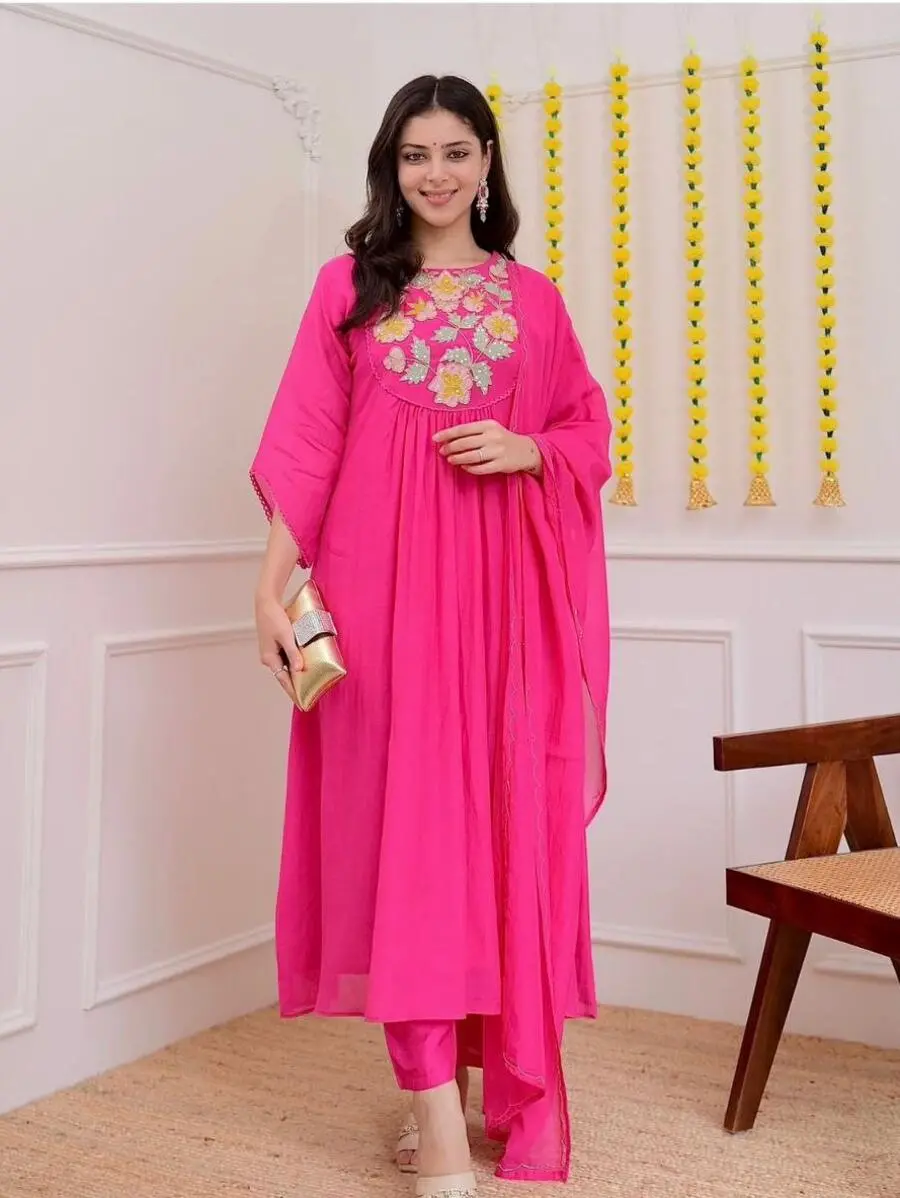 FANCY CHANDERI SILK EMBROIDERY WORK TOP BOTTOM WITH DUPATTA PINK