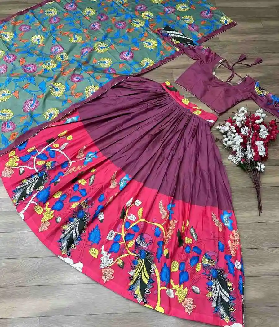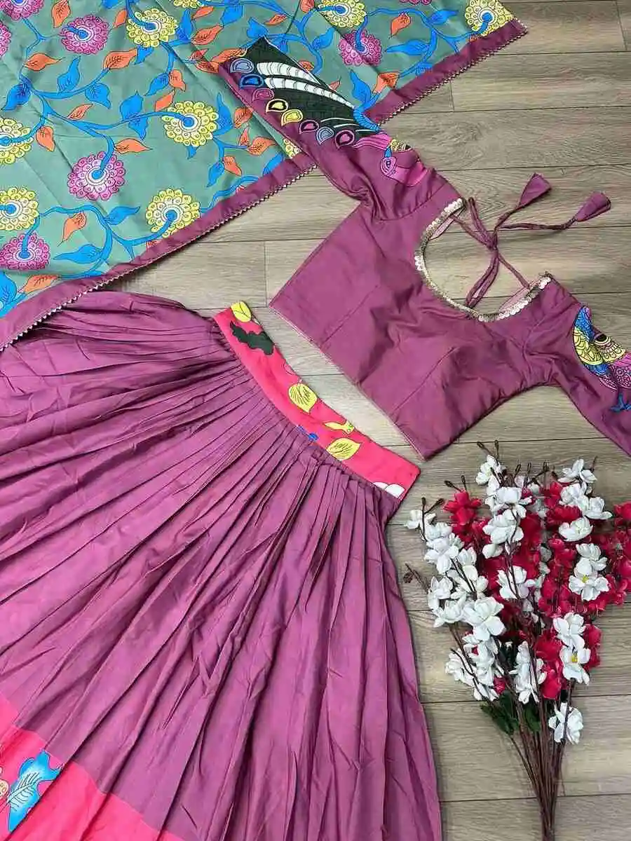 FANCY CHENT CREPE KALAMKARI PRINT WORK LEHENGA CHOLI WITH DUPATTA WINE PINK
