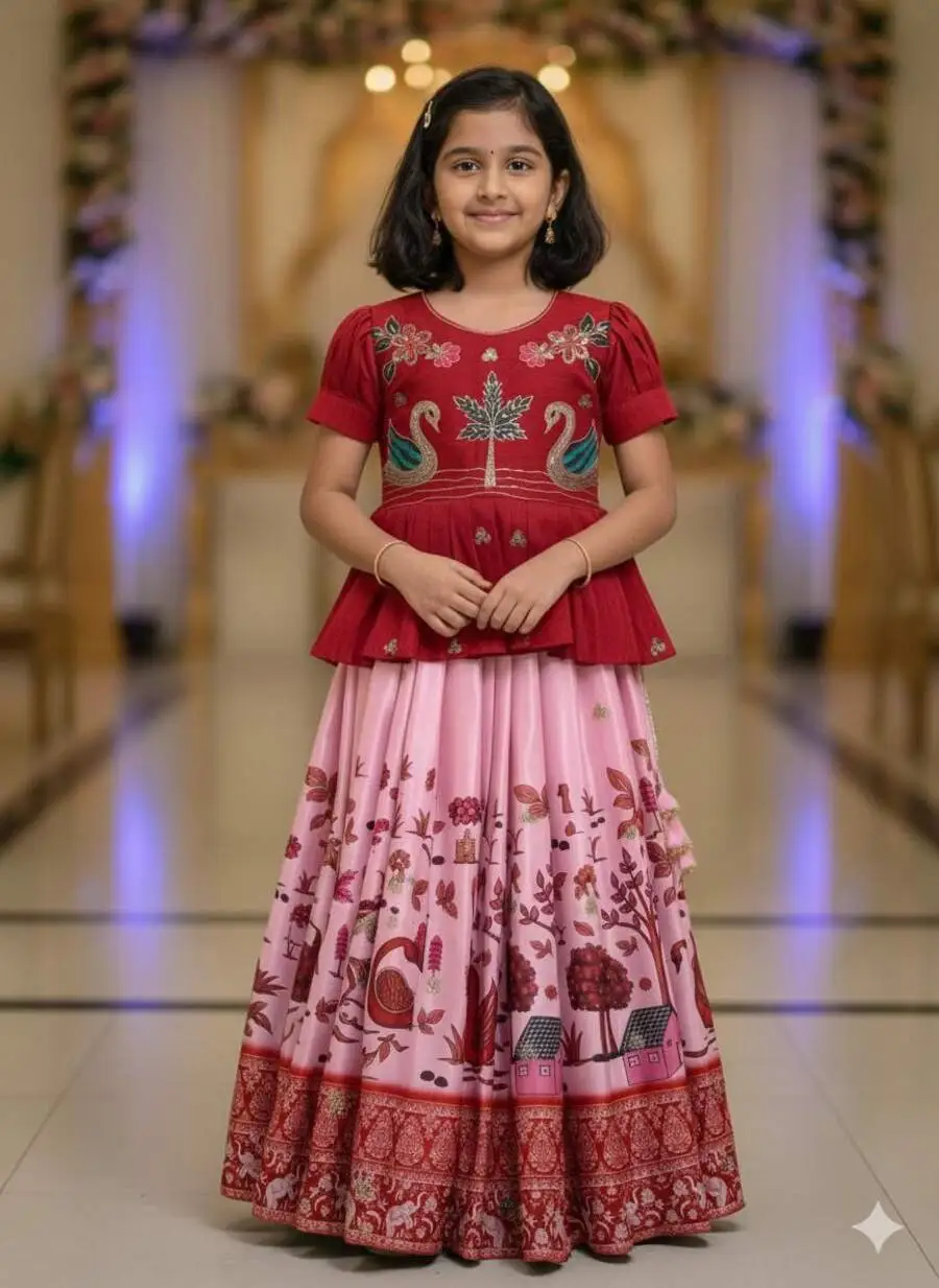 FANCY CHINON EMBROIDERY SEQUENCE WORK KID’S TOP LEHENGA WITH DUPATTA RED