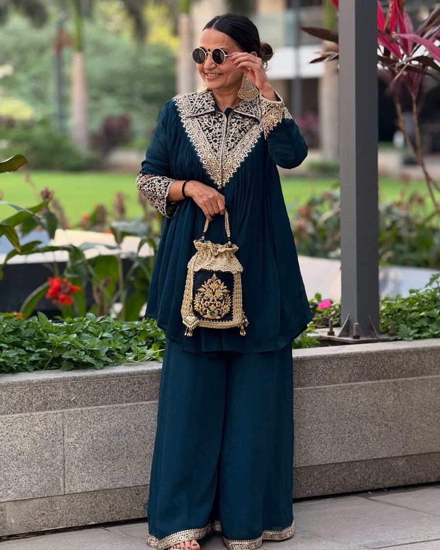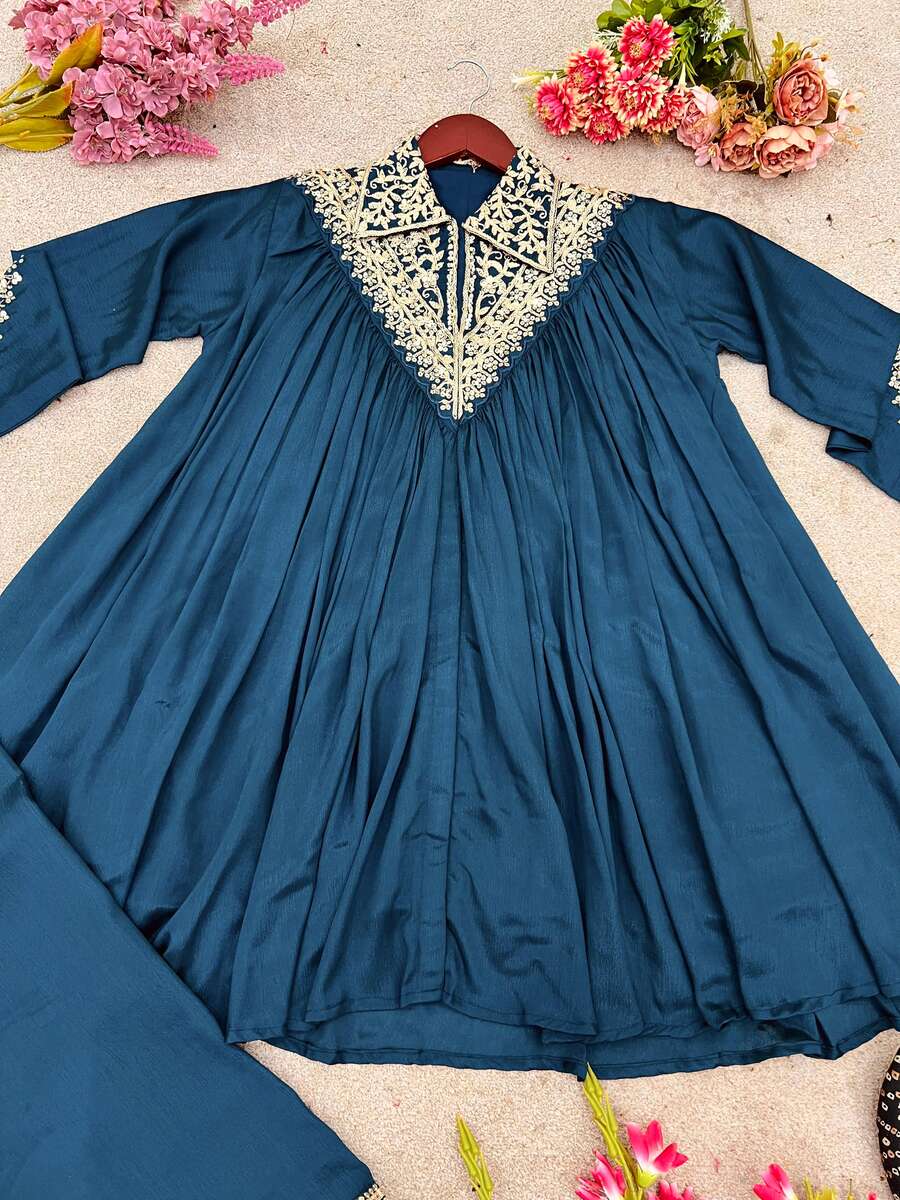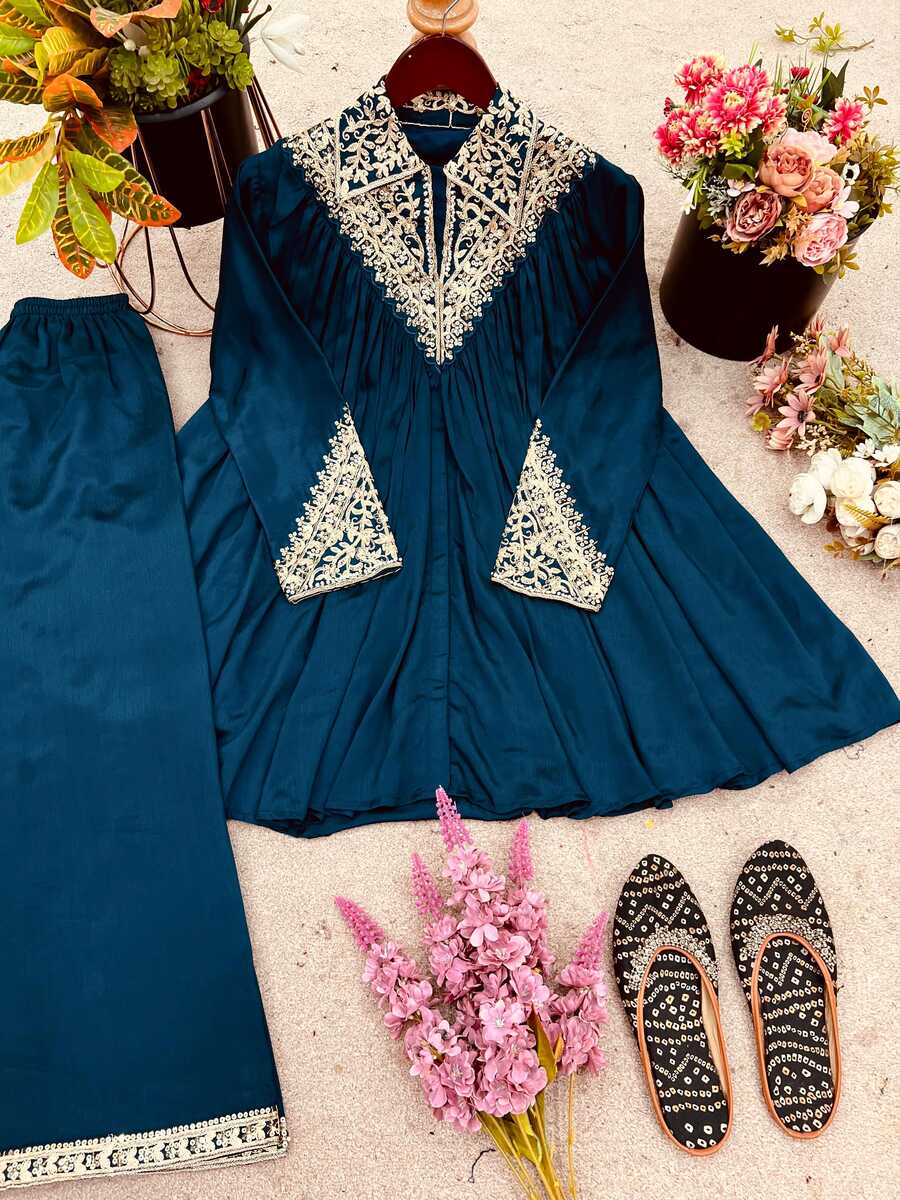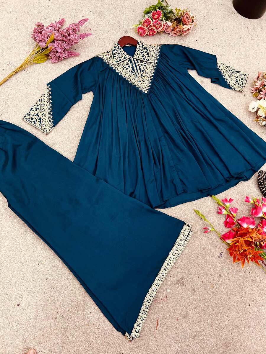 FANCY CHINON EMBROIDERY SEQUENCE WORK TOP PALAZZO SET BLUE
