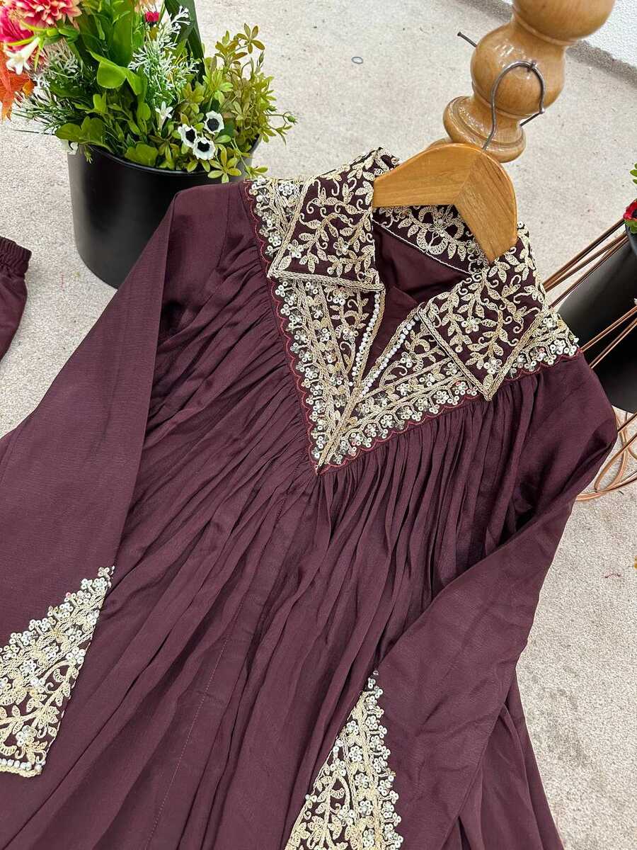 FANCY CHINON EMBROIDERY SEQUENCE WORK TOP PALAZZO SET WINE