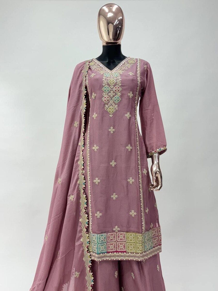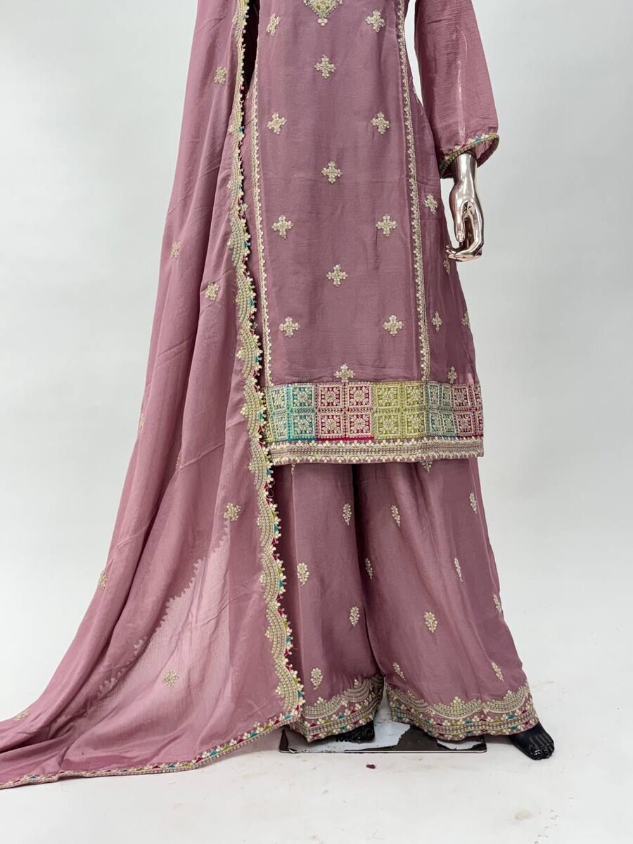 FANCY CHINON EMBROIDERY SEQUENCE WORK TOP PALAZZO WITH DUPATTA PINK