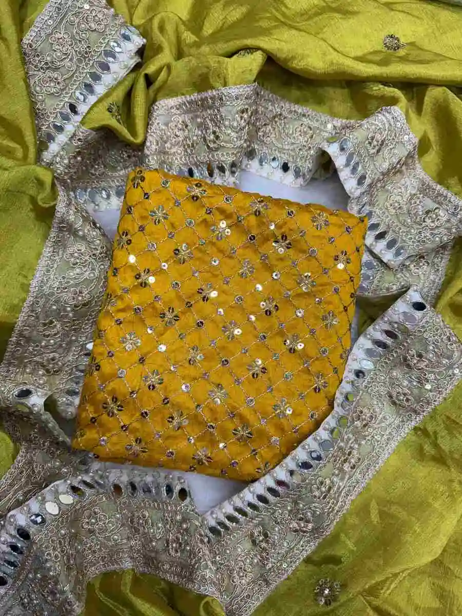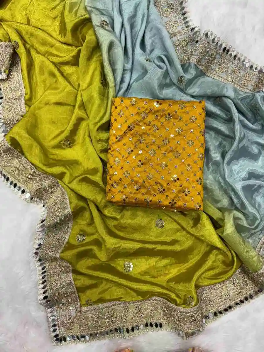 FANCY CHINON SEQUENCE AND DORI EMBROIDERY WITH MOTI AND REAL MIRRRO WORK SAREE WITH UNSTITCHED BLOUSE GREEN AND SKY