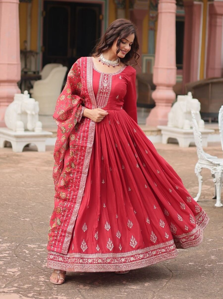 FANCY CHINON SEQUENCE EMBROIDERY WORK GOWN WITH DUPATTA RED