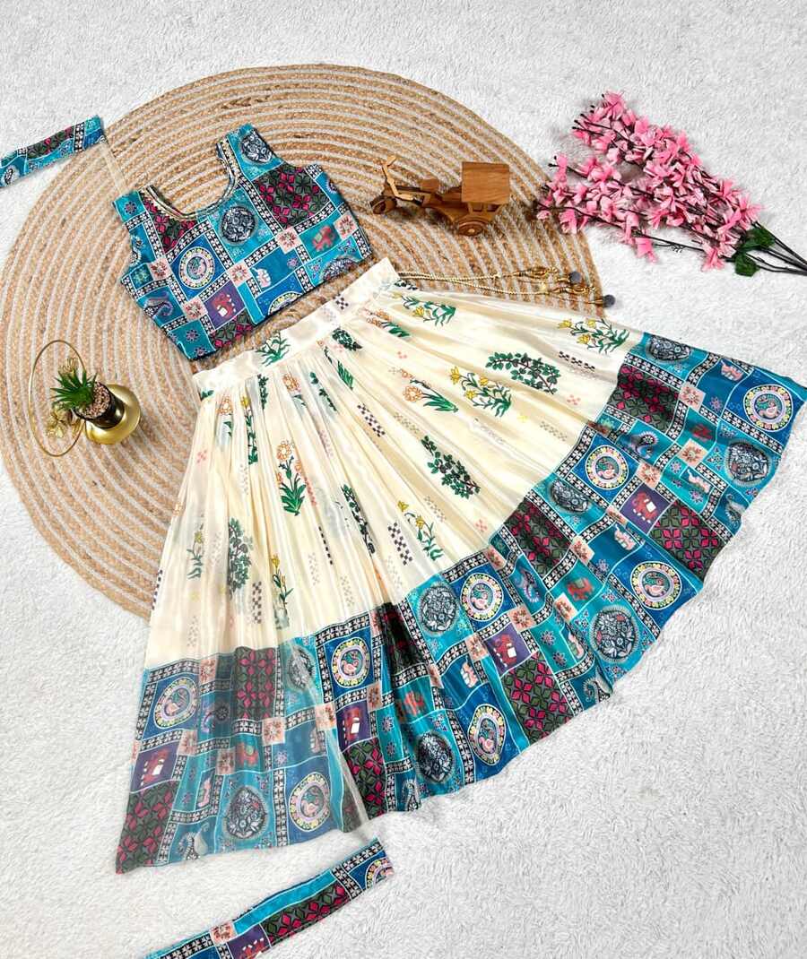FANCY CHINON SILK DIGITAL PRINT & FANCY LACE WORK KID’S LEHENGA CHOLI WITH DUPATTA RAMA