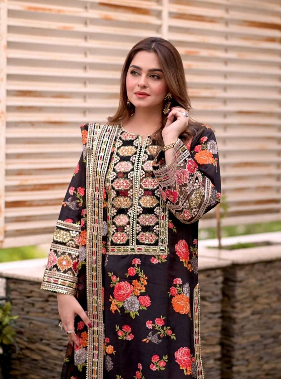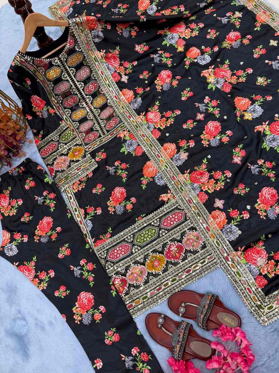 FANCY CHINON SILK DIGITAL PRINT WITH ORGANZA EMBROIDERY SEQUENCE PATCH WORK TOP BOTTOM WITH DUPATTA BLACK