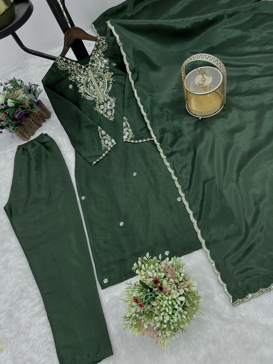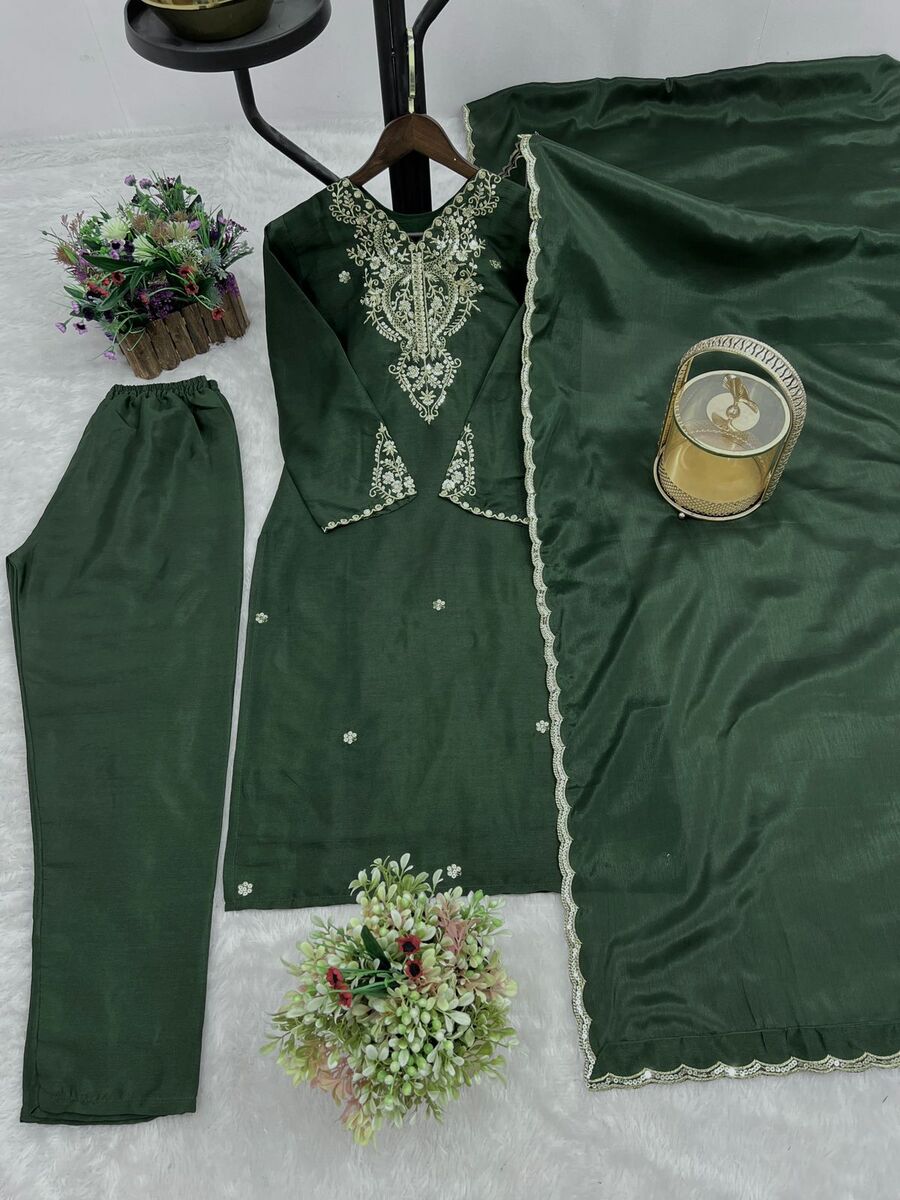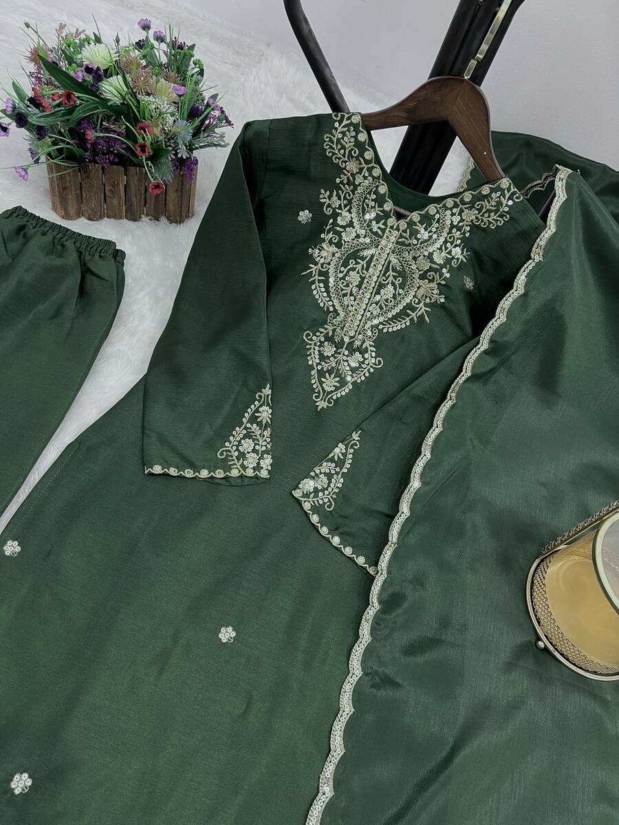 FANCY CHINON SILK EMBROIDERY AND SEQUENCE WORK TOP BOTTOM WITH DUPATTA GREEN