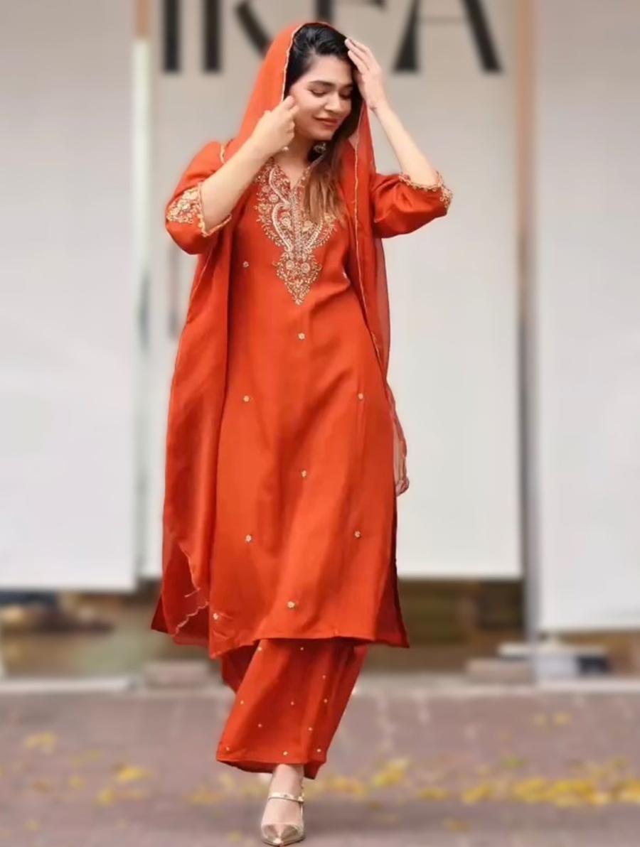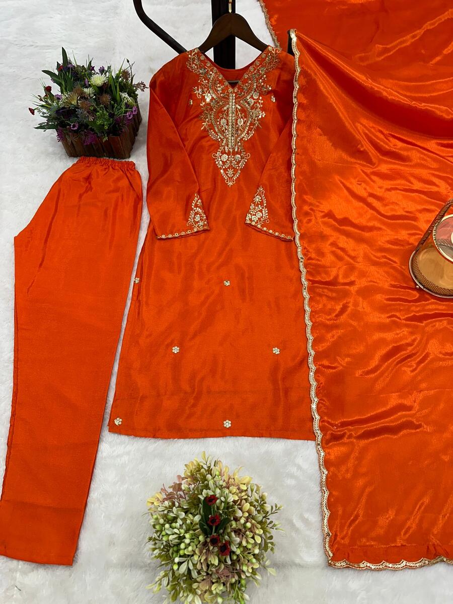 FANCY CHINON SILK EMBROIDERY AND SEQUENCE WORK TOP BOTTOM WITH DUPATTA ORANGE