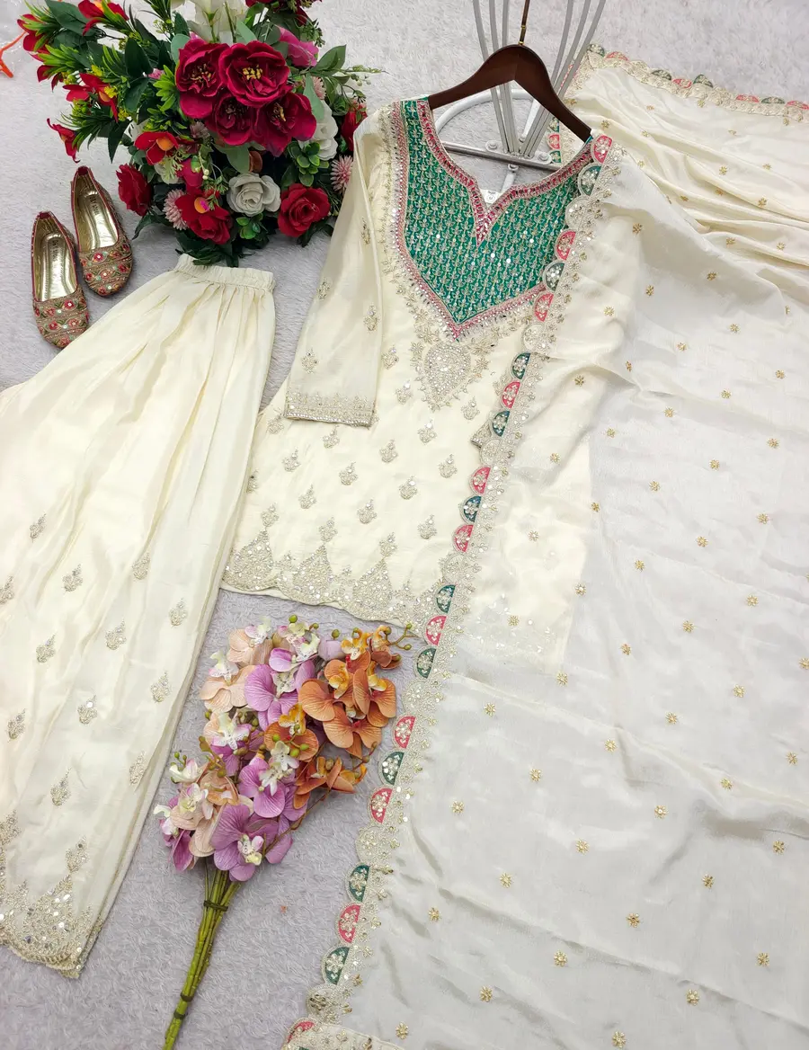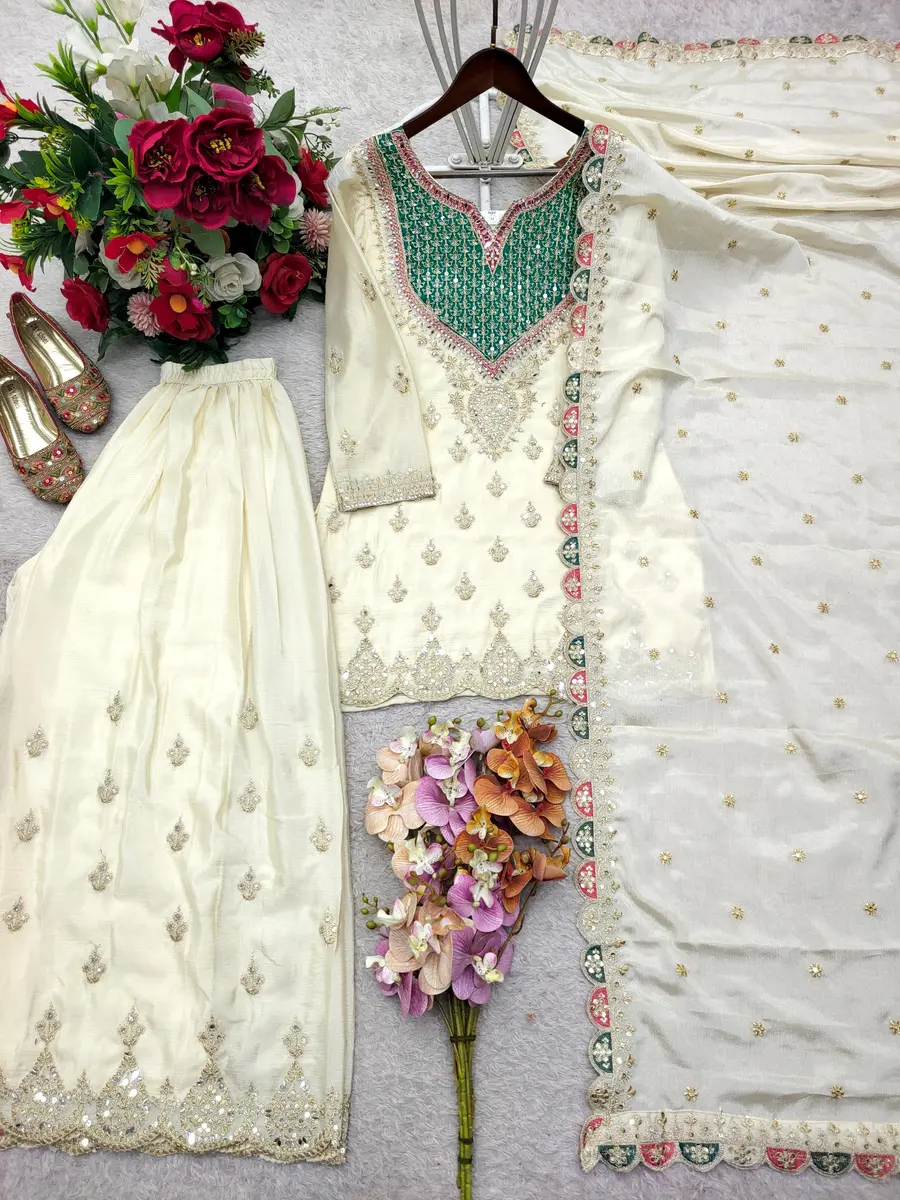 FANCY CHINON SILK EMBROIDERY CODING SEQUENCE WORK WITH HANDS WORKS MIRROR DIAMOND WORK TOP PALAZZO WITH DUPATTA OFF WHITE AND RAMA