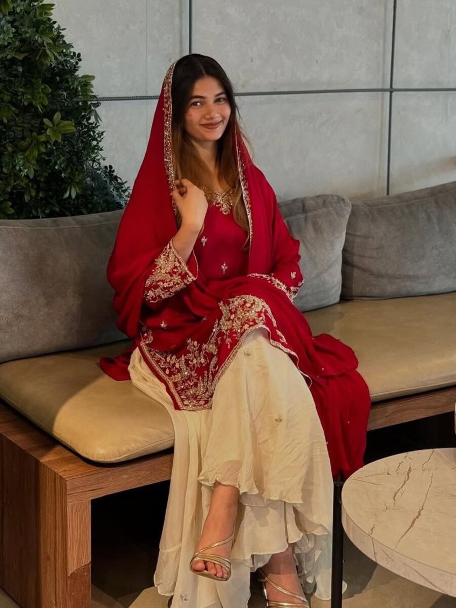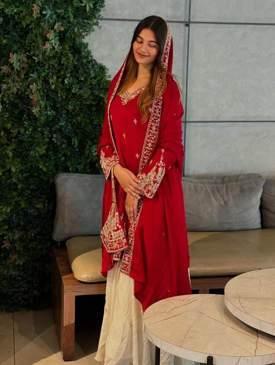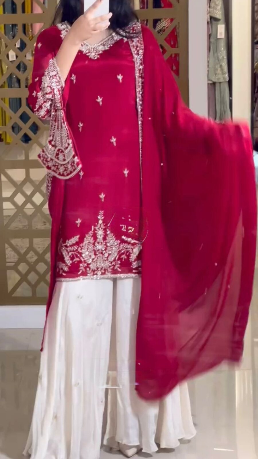 FANCY CHINON SILK EMBROIDERY SEQUENCE FANCY MOTI LATKAN BORDER WORK TOP PALAZZO WITH DUPATTA RED