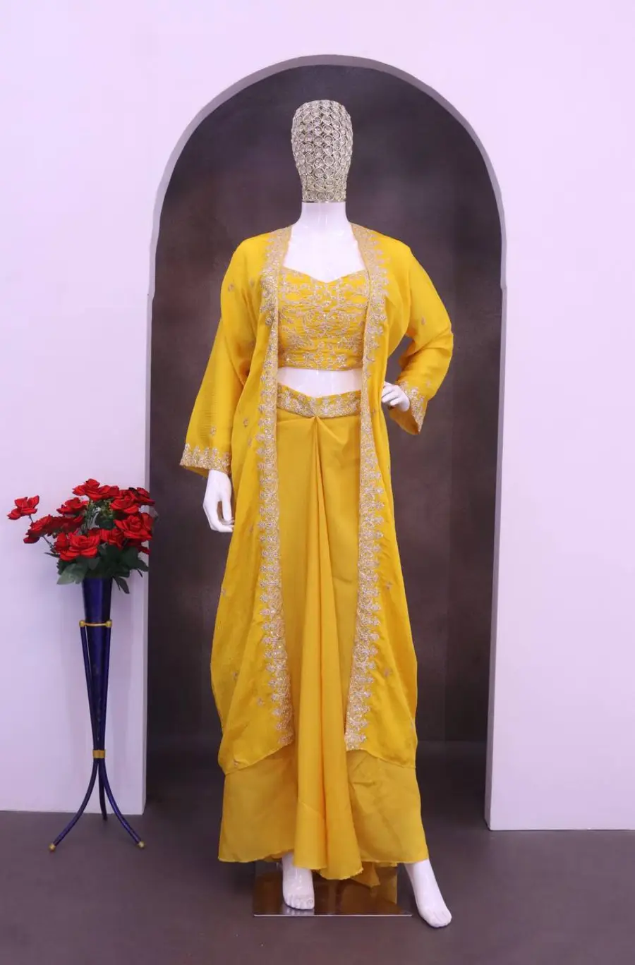 FANCY CHINON SILK EMBROIDERY SEQUENCE WORK BLOUSE DRAPE SKIRT AND SHRUG YELLOW