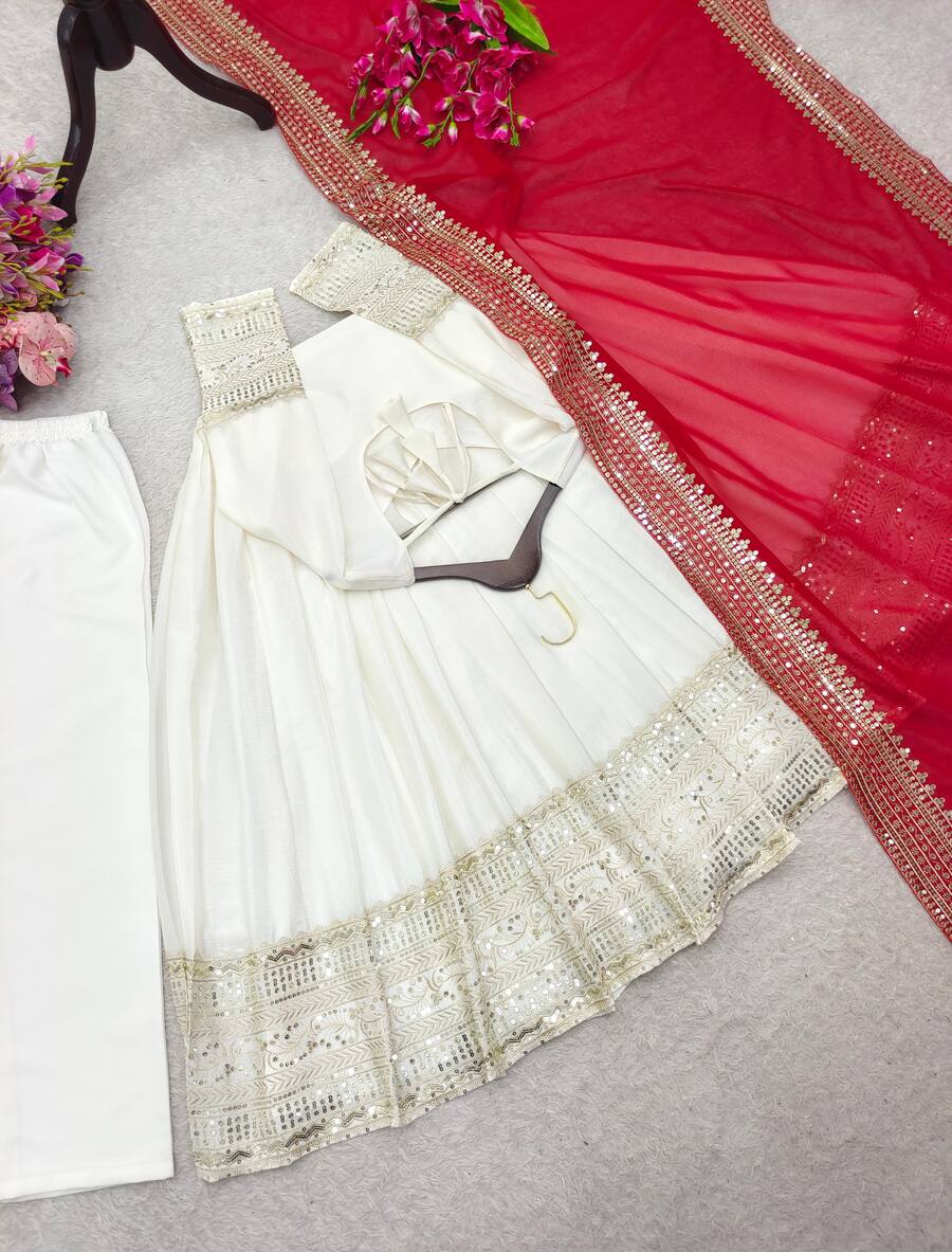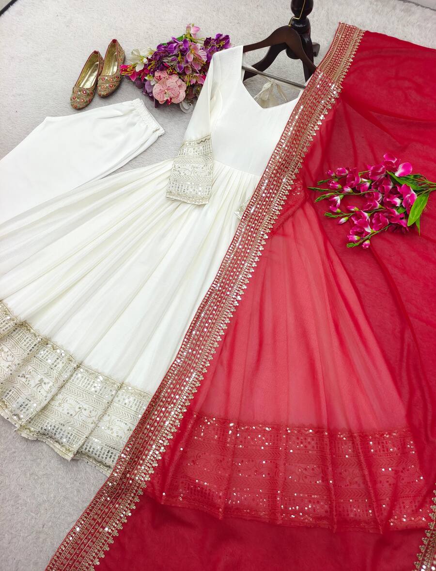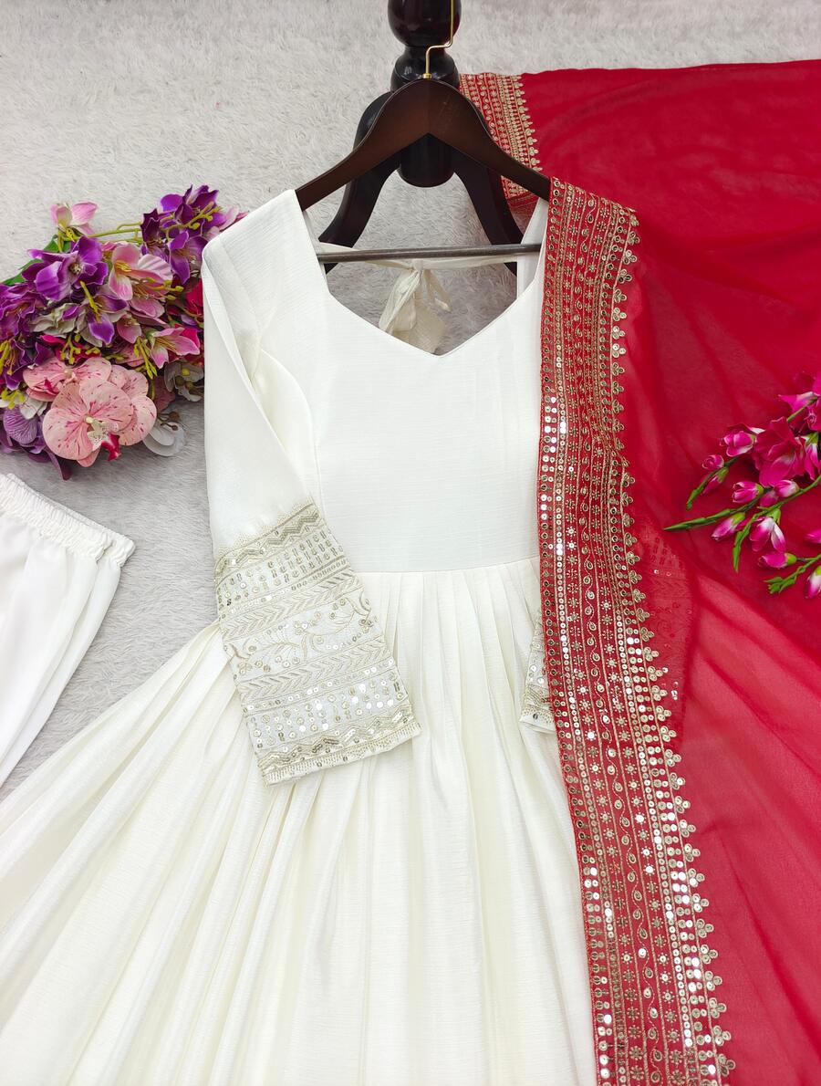 FANCY CHINON SILK EMBROIDERY SEQUENCE WORK GOWN BOTTOM WITH DUPATTA WHITE