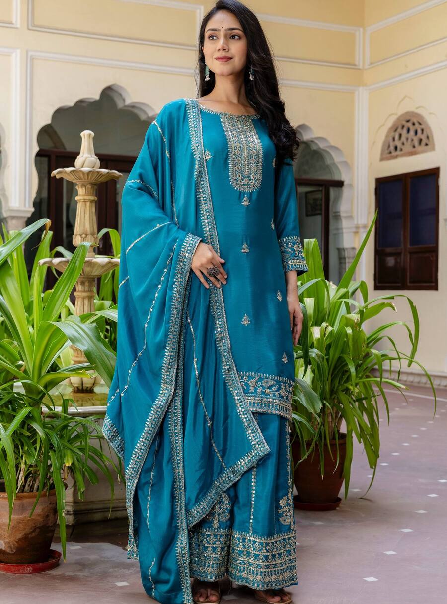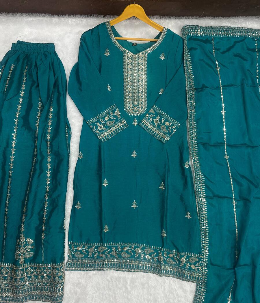 FANCY CHINON SILK EMBROIDERY SEQUENCE ZARI WOEK TOP PALAZZO WITH DUPATTA RAMA