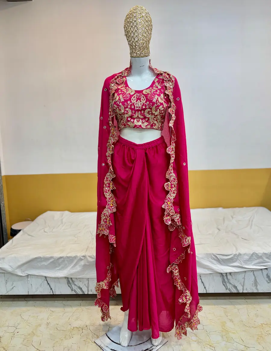 FANCY CHINON THREAD, EMBROIDERY , ZARI AND SEQUENCE WORK BUSTIER SRAPE SKIRT WITH SHRUG STYLE DUPATTA PINK