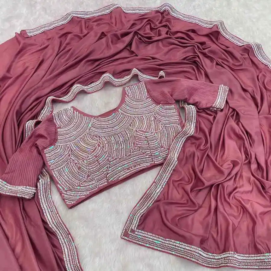 FANCY CHOCOLATE SILK BEADS EMBROIDERY LACE WORK SAREE WITH STITCHED BLOUSE PEACH
