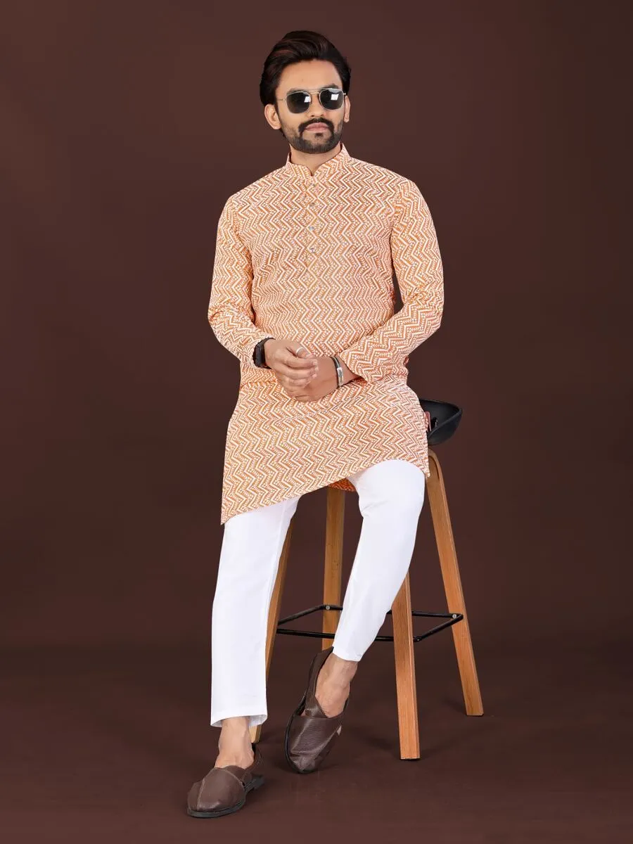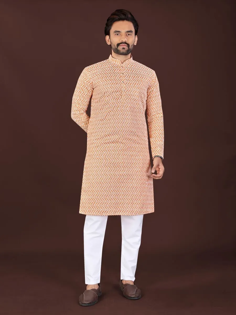 FANCY COTTON BLEND HANDCRAFTED LUCKHNAWI CHIKANKARI WORK MEN’S KURTA PAYJAMA PEACH