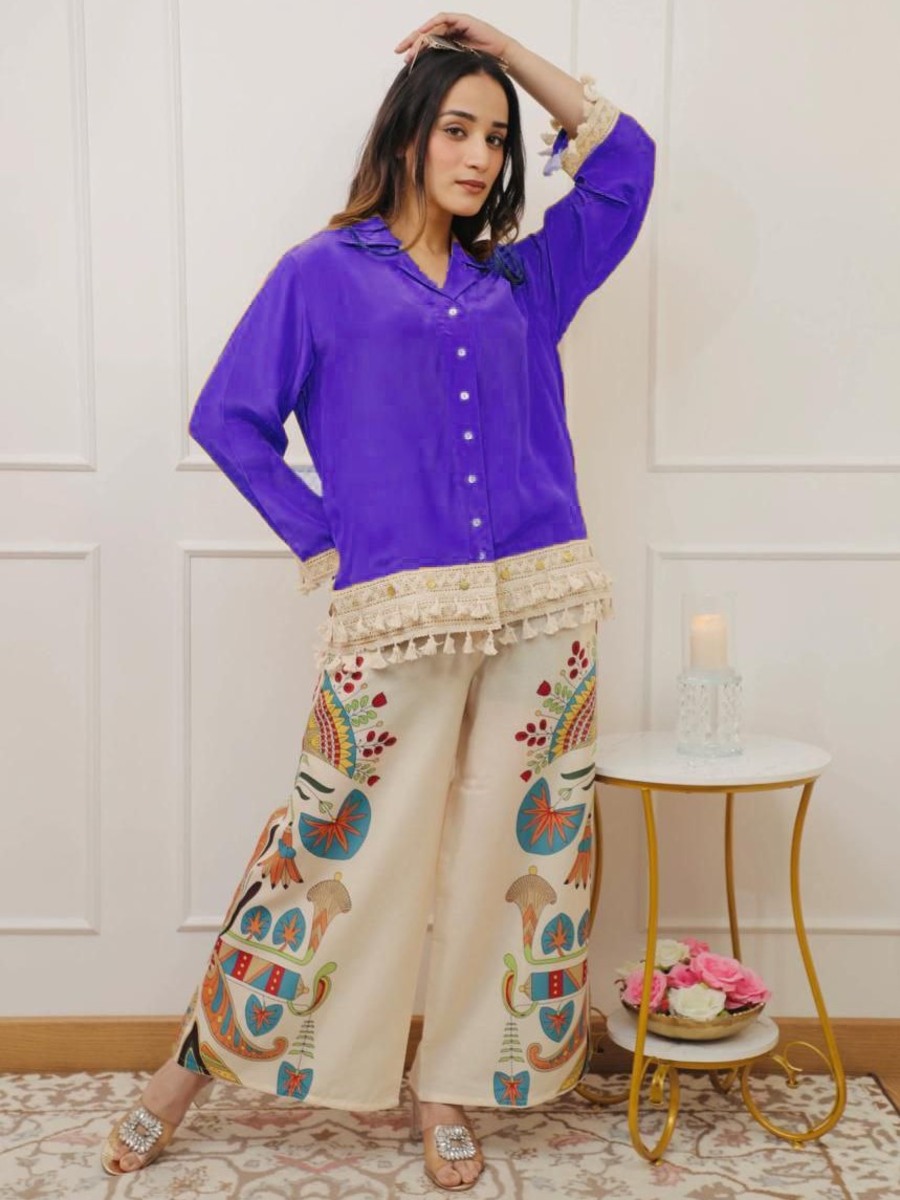 FANCY COTTON BUTTONS AND LACE WORK TOP PALAZZO SET PURPLE