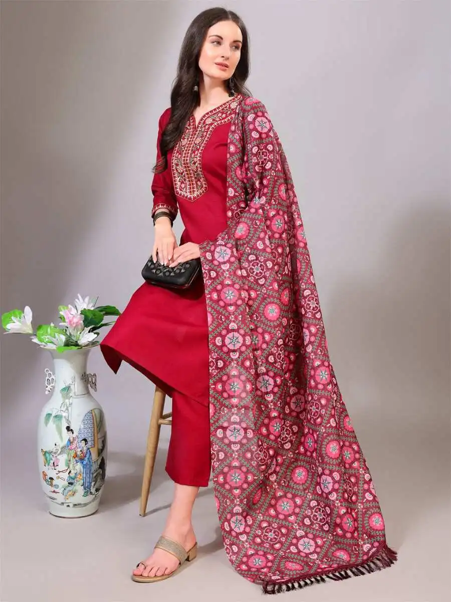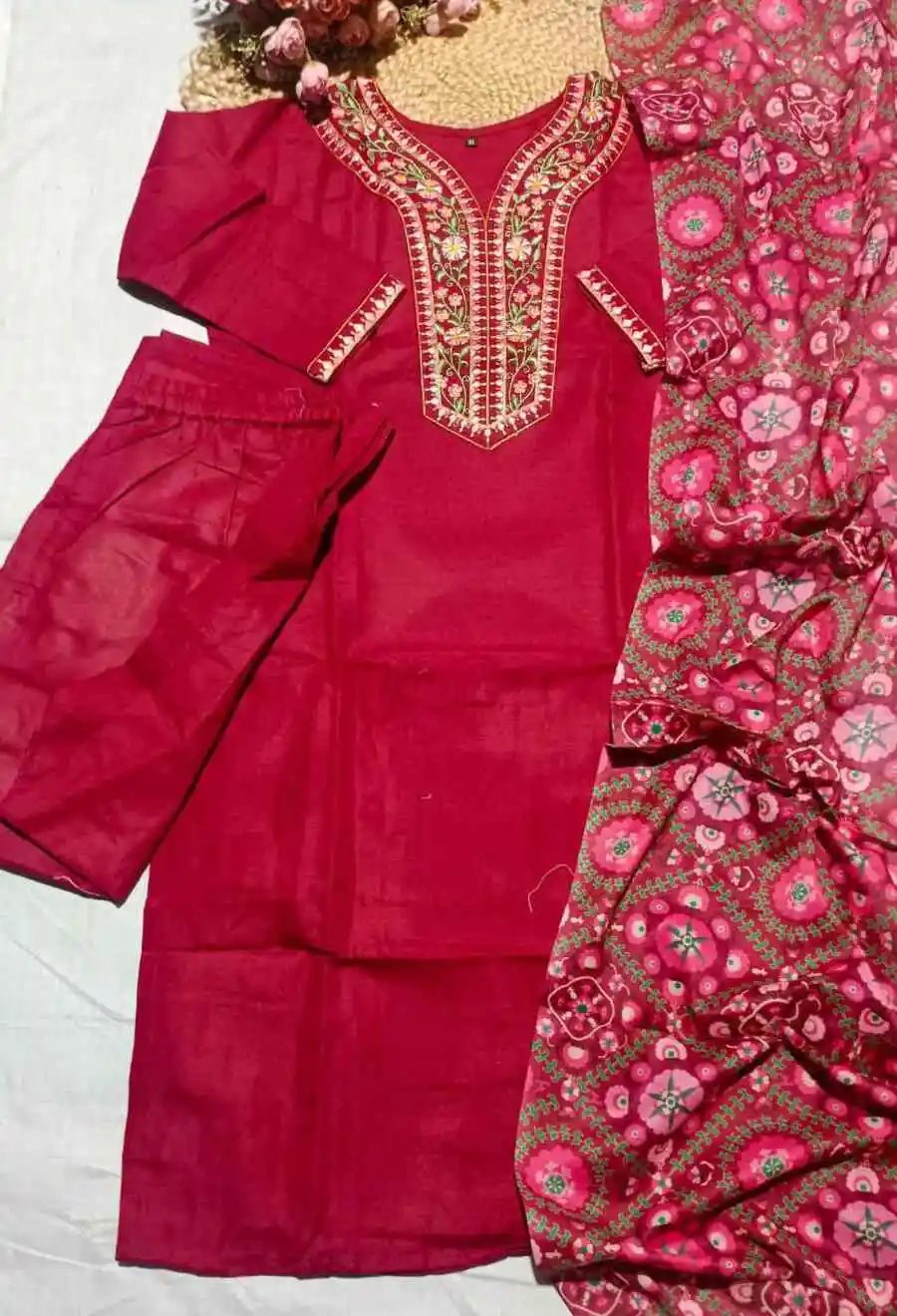 FANCY COTTON EMBROIDERY WORK TOP BOTTOM WITH DUPATTA RED