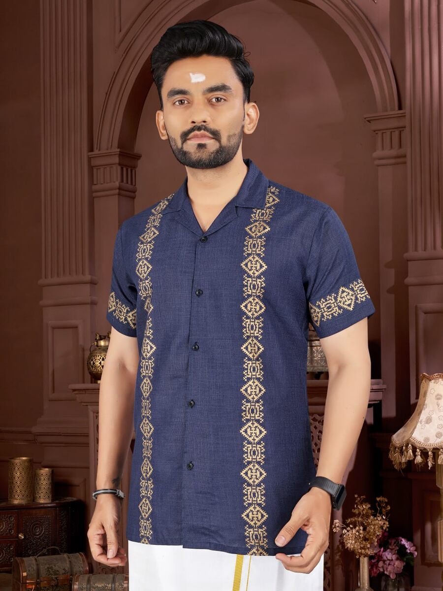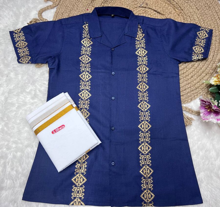 FANCY COTTON FOIL PRINT WITH BEAUTIFUL PATTERN WORK MEN’S SHIRT WITH MATCHING DHOTI BLUE