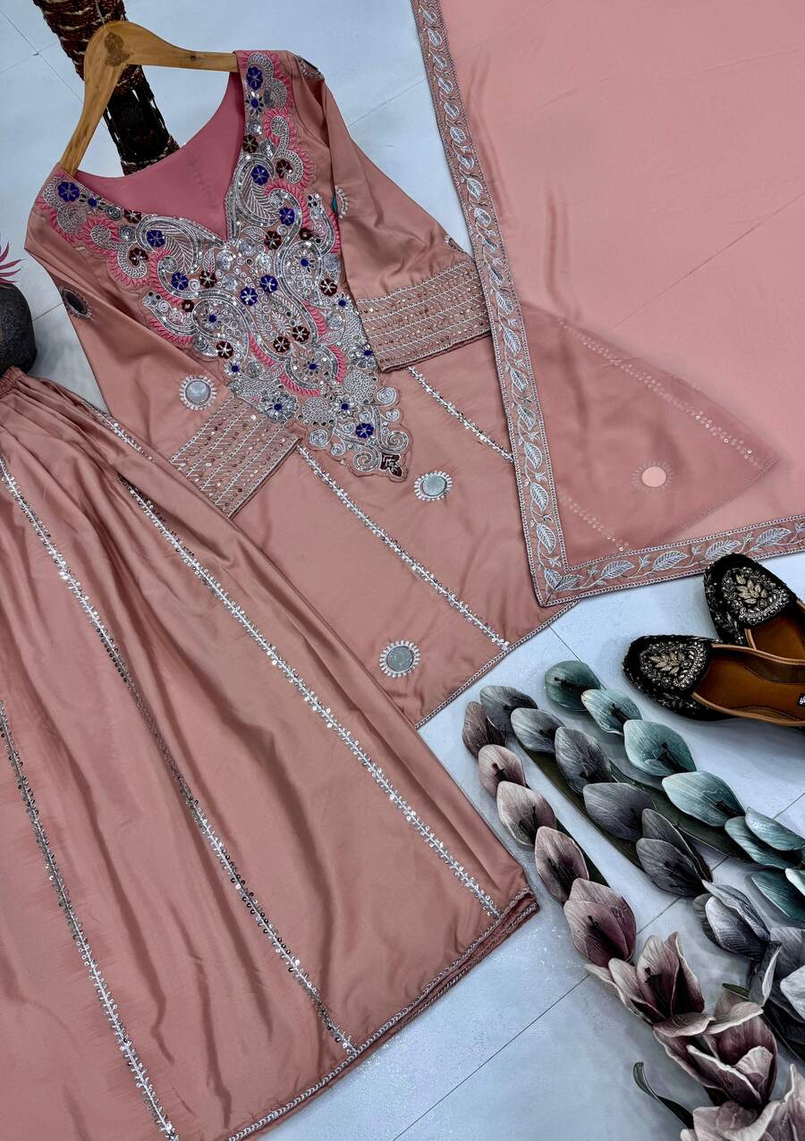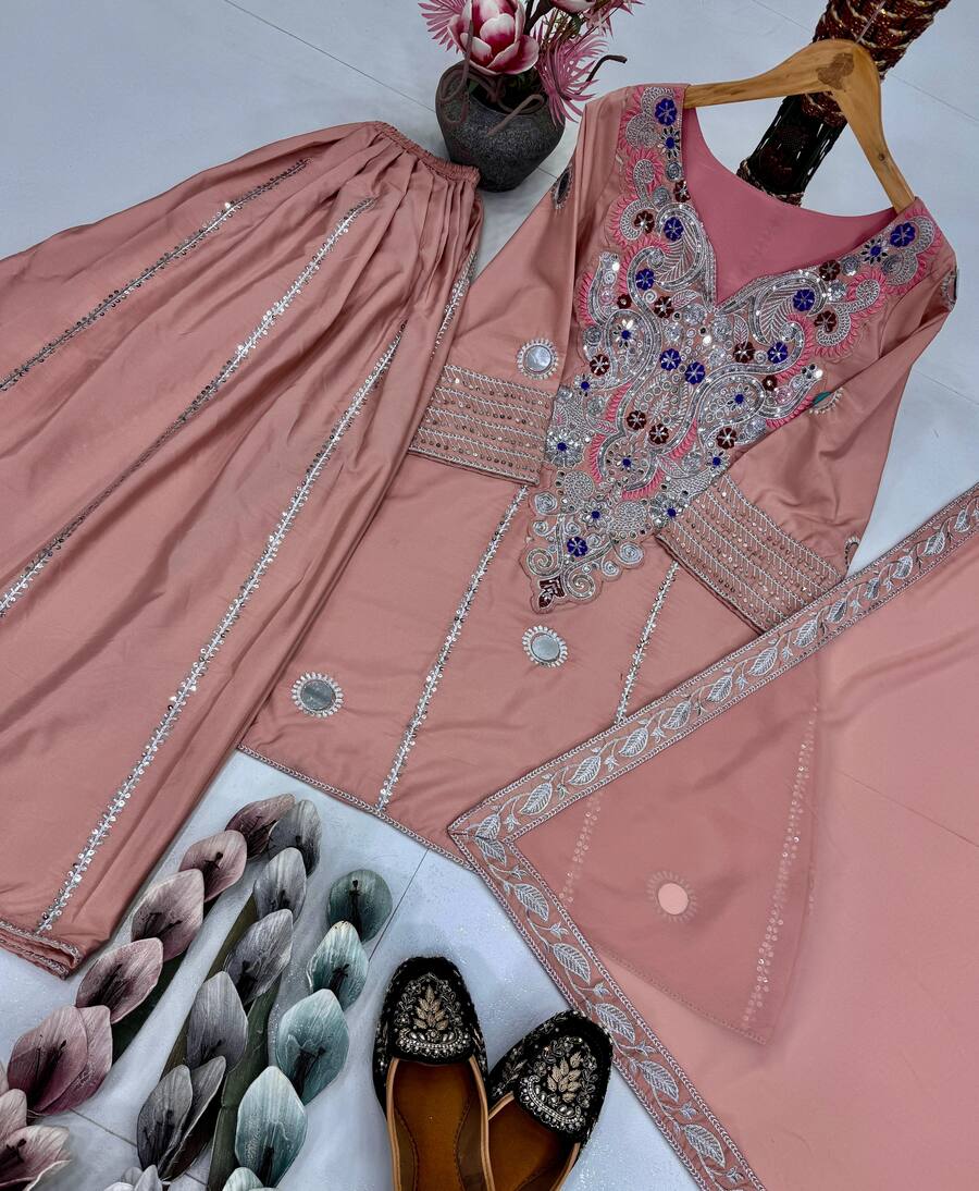 FANCY CREPE EMBROIDERY SEQUENCE WORK WITH REAL MIRROR HAND WORK TOP PALAZZO WITH DUPATTA BABY PINK
