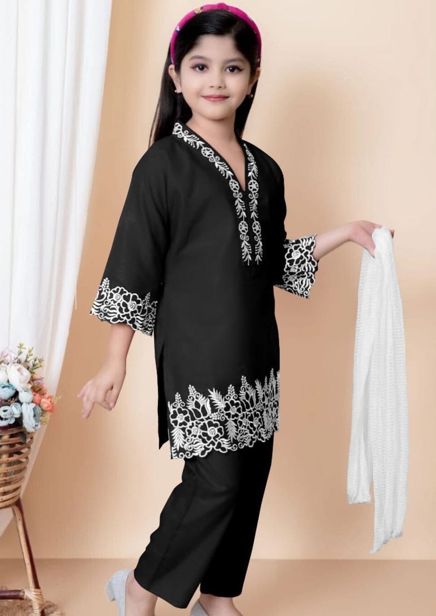 FANCY CREPE EMBROIDERY WORK KID’S TOP BOTTOM WITH DUPATTA BLACK