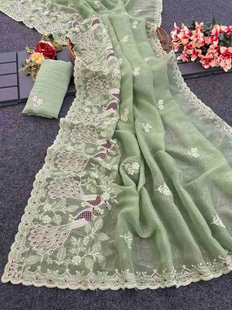 FANCY CRUNCHY SILK CONTRAST PALLU EMBROIDERY AND CUT BORDER WORK SAREE WITH UNSTITCHED BLOUSE PISTA