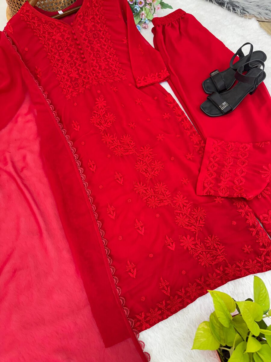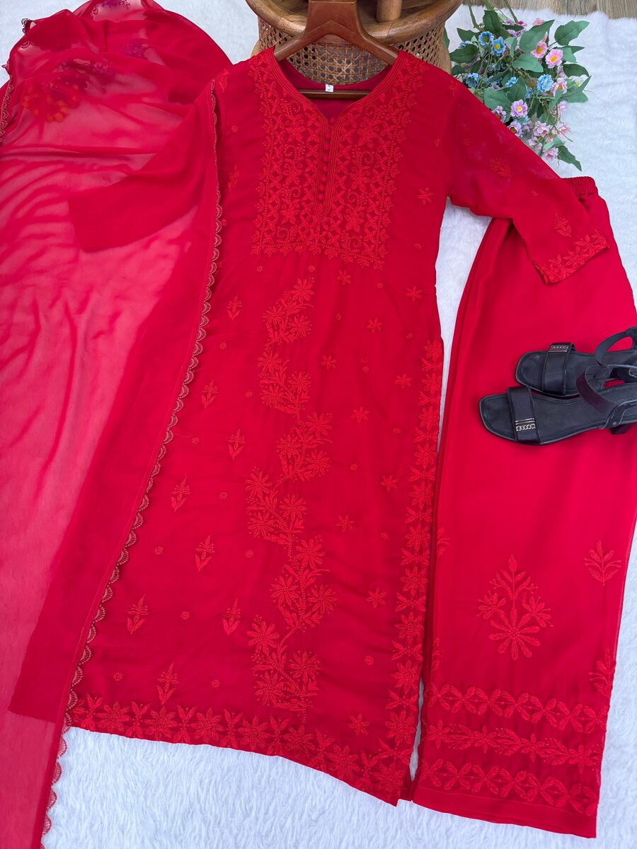 FANCY GEORGETTE BLOOMING COTTON EMBROIDERY WORK TOP PALAZZO WITH DUPATTA RED