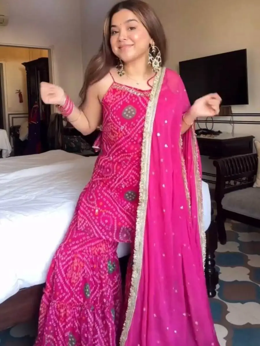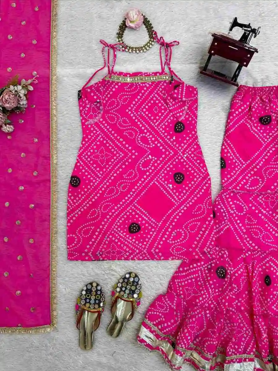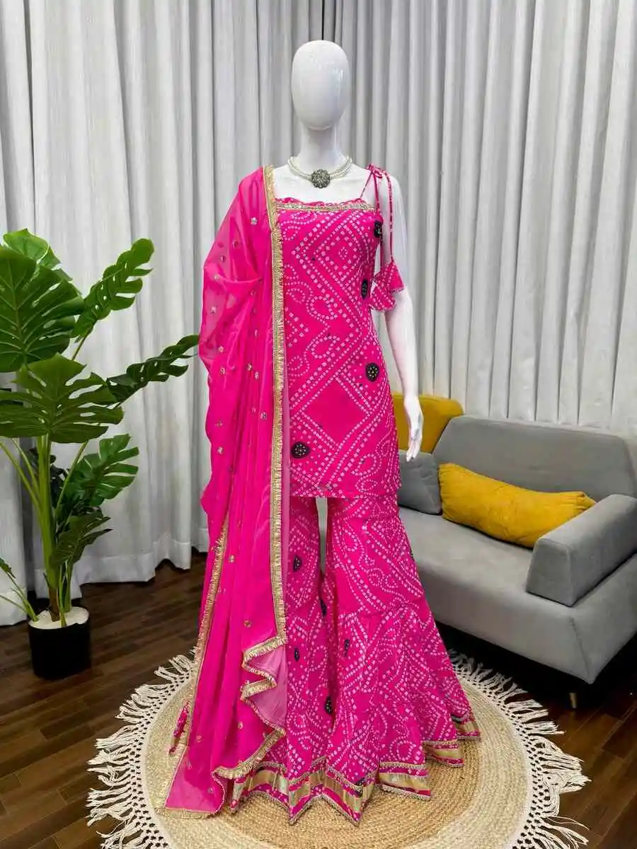 FANCY GEORGETTE DIGITAL PRINT AND REAL MIRROR WORK TOP SHARARA WITH DUPATTA PINK