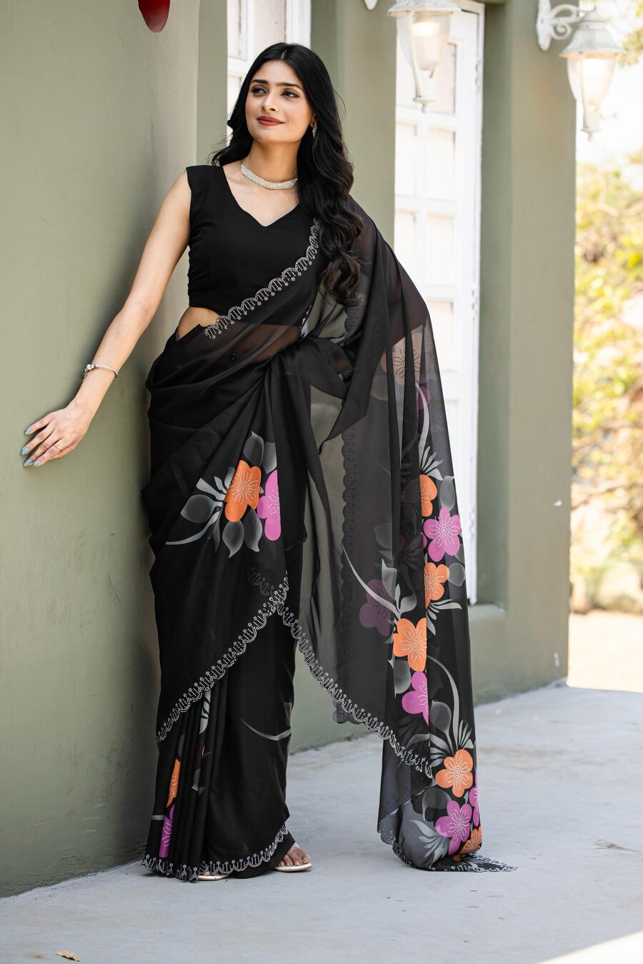 FANCY GEORGETTE DIGITAL PRINT WITH HOT FIX SWARIVSKI DIMOND WORK SAREE WITH UNSTITCHED BLOUSE BLACK