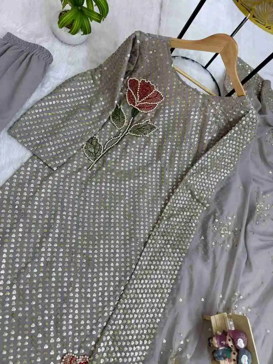 FANCY GEORGETTE DUAL SEQUENCE HEAVY EMBROIDERY & PEARL MOTI WORK TOP BOTTOM WITH DUPATTA GREY