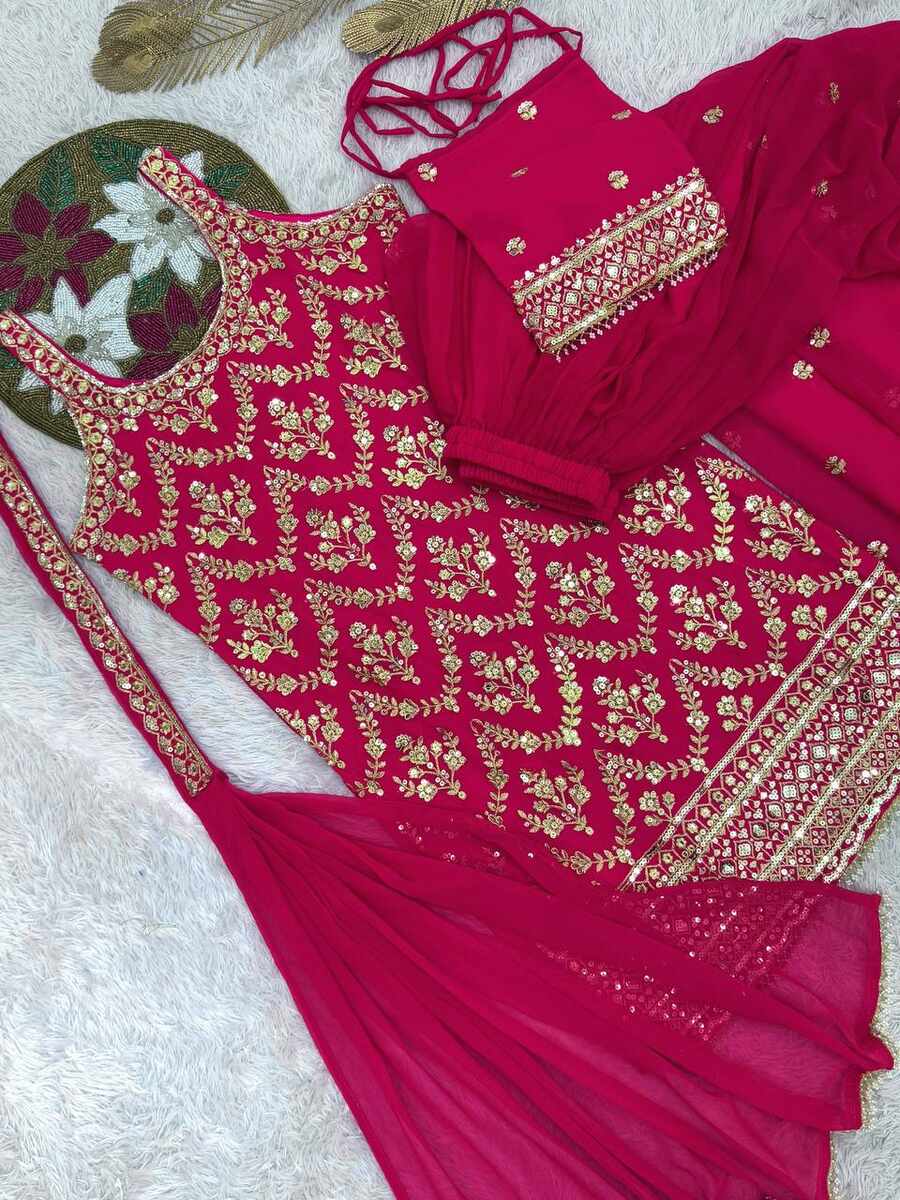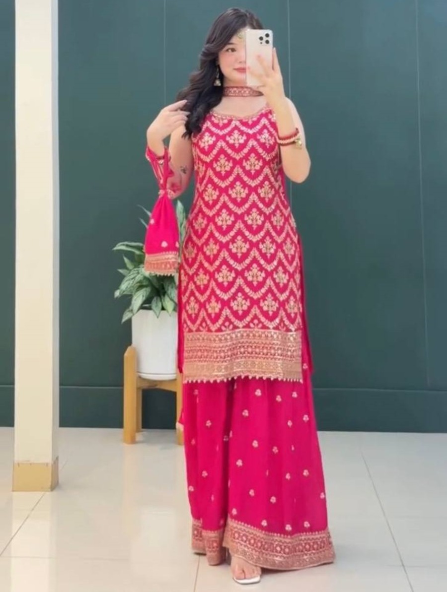 FANCY GEORGETTE EMBROIDERY AND SEQUENCE WORK WITH HANGING LATKAN WORK TOP PALAZZO WITH DUPATTA PINK