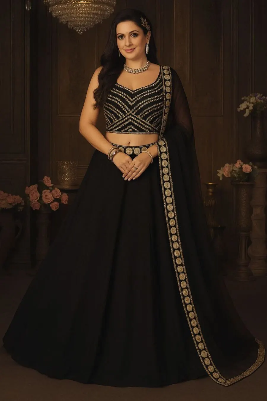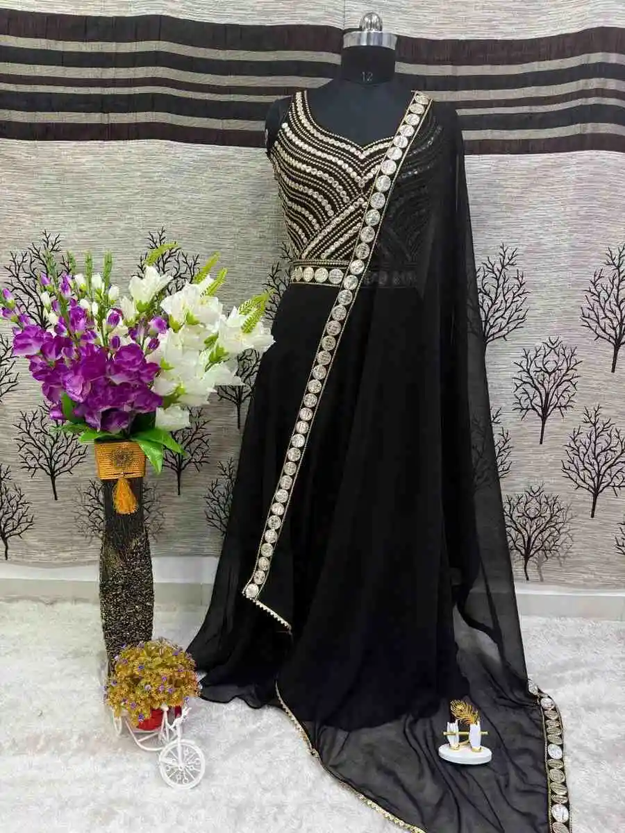 FANCY GEORGETTE EMBROIDERY FOIL WORK LEHENGA CHOLI WITH DUPATTA BLACK