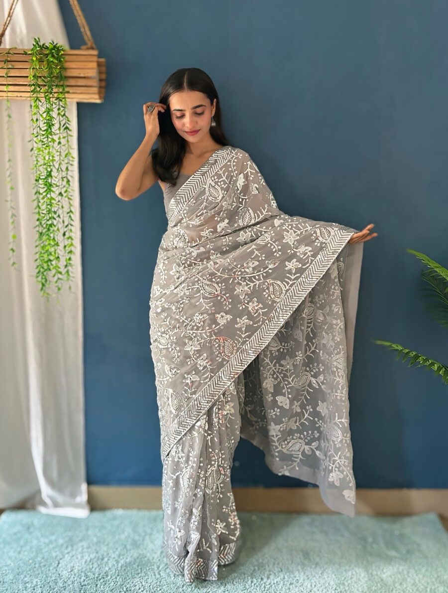 FANCY GEORGETTE EMBROIDERY SEQUENCE LACE WORK SAREE WITH UNSTITCHED BLOUSE GREY