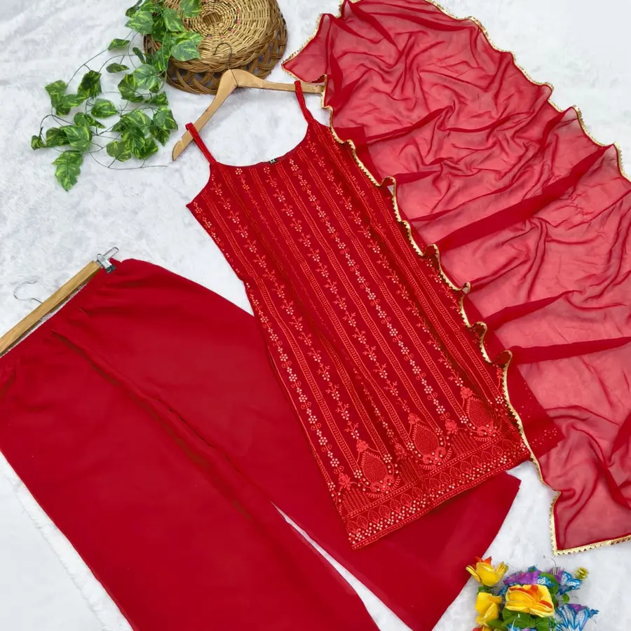 FANCY GEORGETTE EMBROIDERY SEQUENCE WORK TOP PALAZZO WITH DUPATTA RED