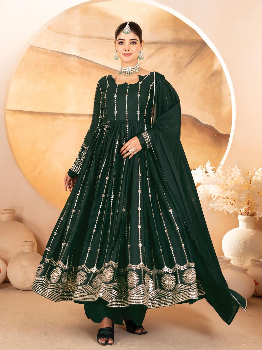 FANCY GEORGETTE EMBROIDERY THREAD SEQUENCE WORK GOWN BOTTOM WITH DUPATTA GREEN