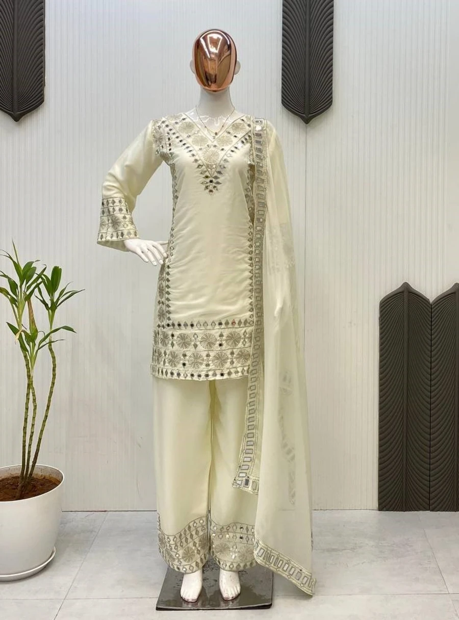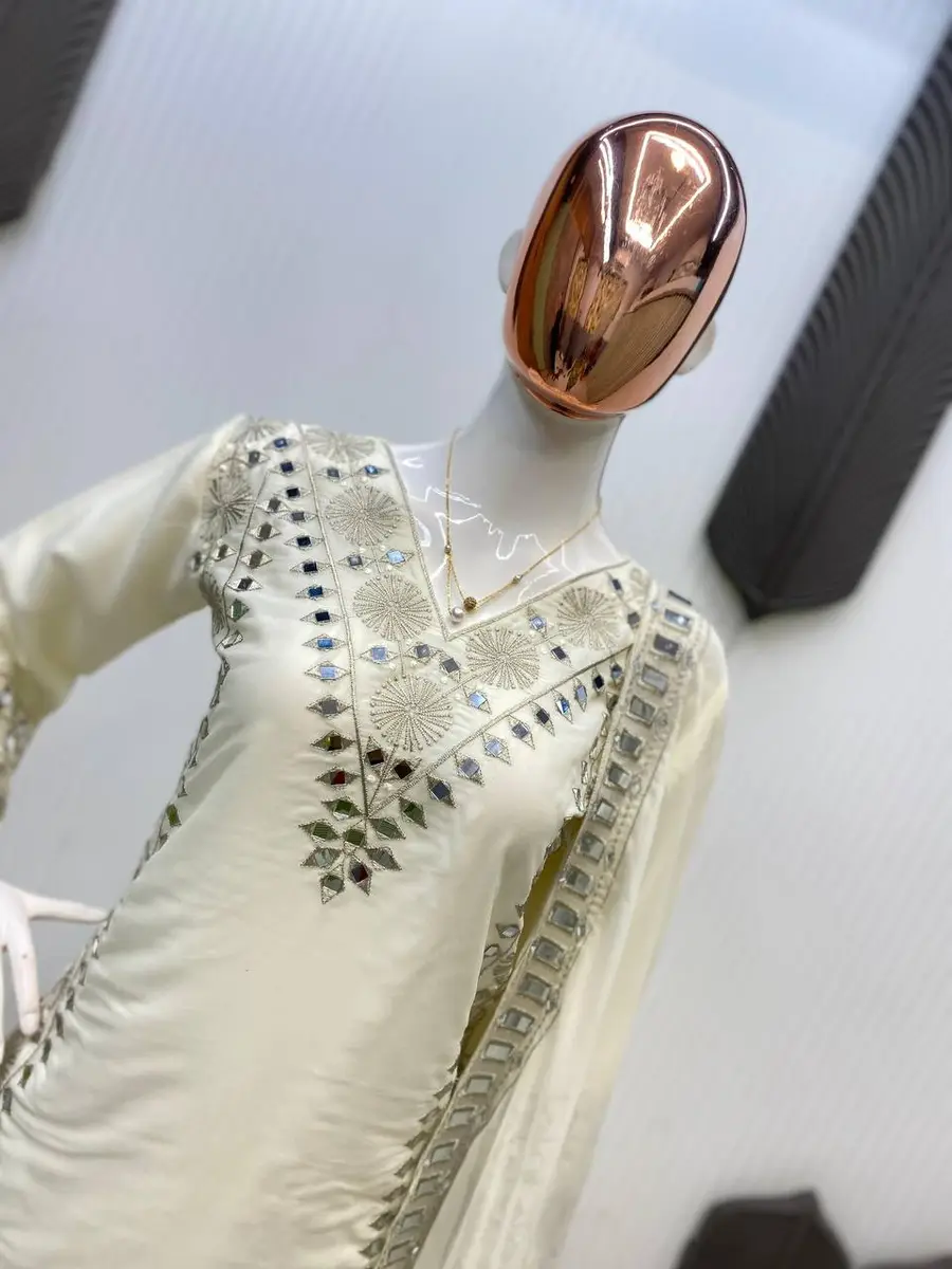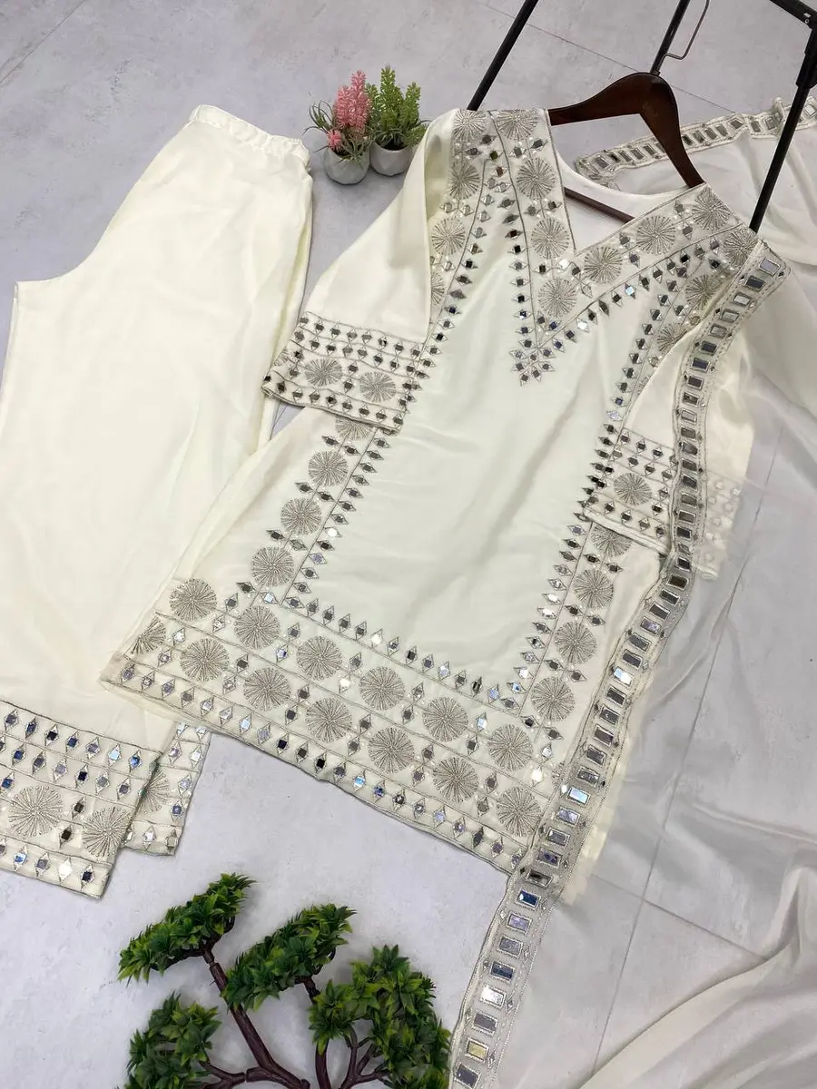 FANCY GEORGETTE EMBROIDERY WITH REAL MIRROR WORK TOP PALAZZO WITH DUPATTA OFF WHITE