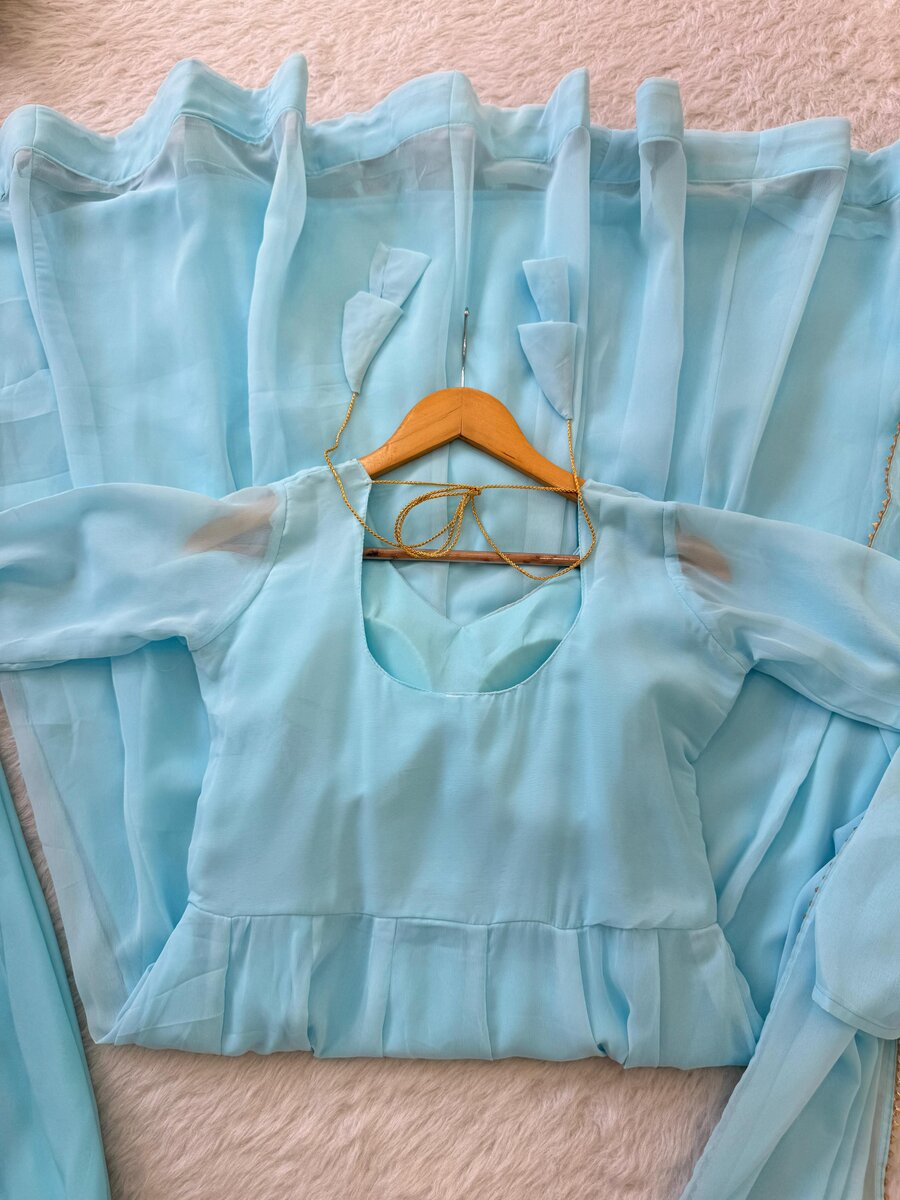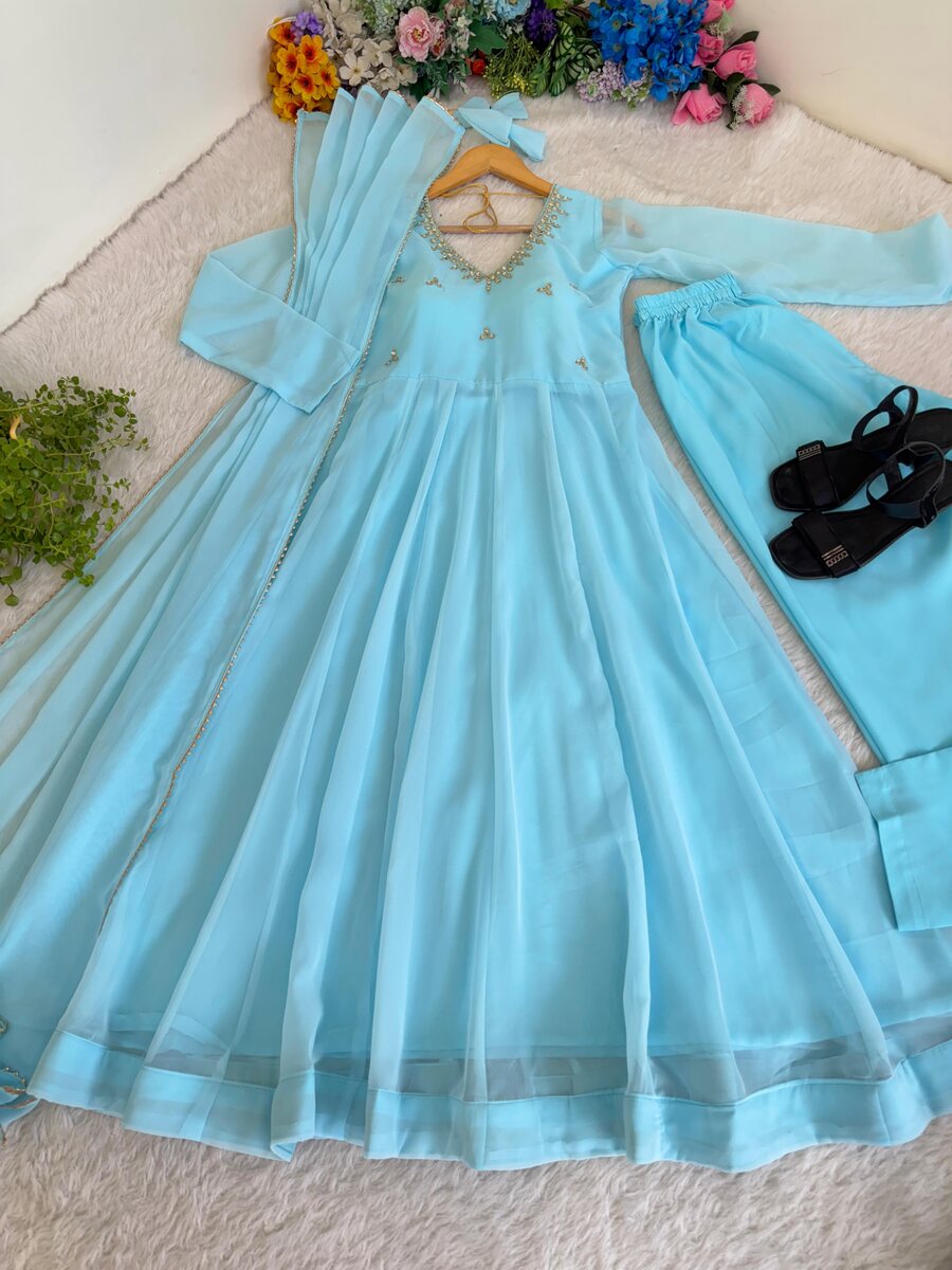 FANCY GEORGETTE HAND EMBROIDERY, REAL MIRROR KASAB JARI WORK GOWN BOTTOM WITH DUPATTA SKY